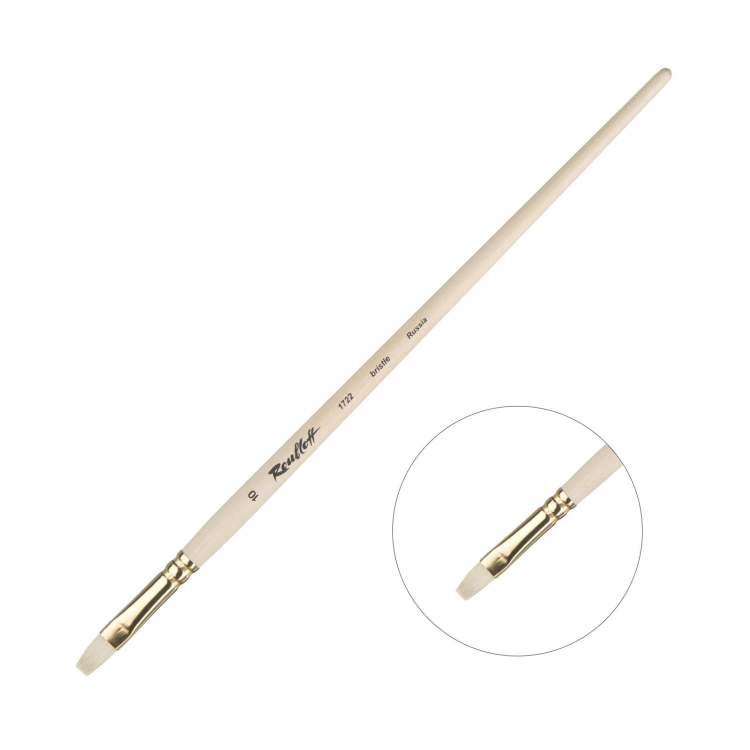 Плоская кисть с укороченной выставкой из волоса щетины с длинной ручкой, пропитанной лаком, является наиболее оптимальным инструментом для живописной работы с густыми красками в пастозной технике. Анодированная алюминиевая обойма надежно собирает очень жесткие, но упругие волоски, которые хорошо наполняются пигментом и отлично отдают краску на поверхность холста. Кисть с такой формой предназначена для работы на крупных участках полотна, а также удобна при изображении архитектурных построек и транспортных средств, идеальна для выполнения короткого, прямоугольного мазка и для процесса колеровки