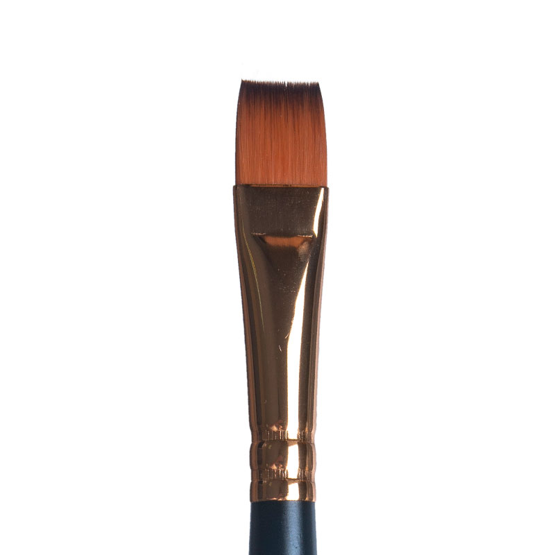 Плоская кисть с укороченной выставкой из синтетики под колонок применяется во всех видах живописи. Анодированная алюминиевая обойма надежно защищает ворсинки изделия и прочно скрепляет с короткой черной матовой ручкой.