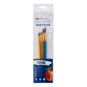 В наборе 5 кистей с ворсом пони. Ручка окрашенное дерево. Кисти различного размеры круглой формы: № 1,2, 3, 4, 5