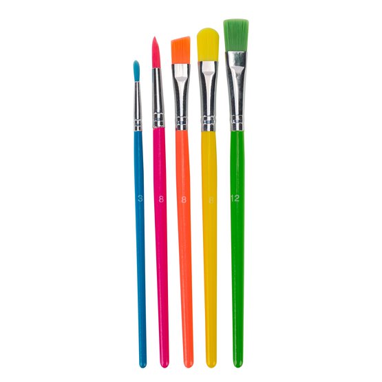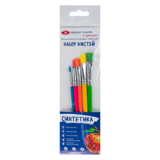 В наборе 5 кистей с нейлоновым ворсом. Ручка окрашенное дерево. Кисти различного размеры и формы: плоская №12, плоская угловая №8, плоская овальная №8, круглая №8, круглая №3. Кисти легко отмываются после работы с красками, клеем.