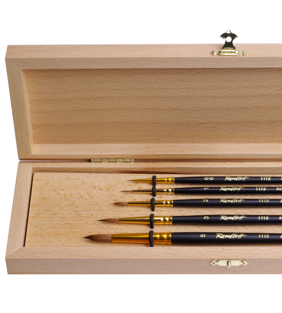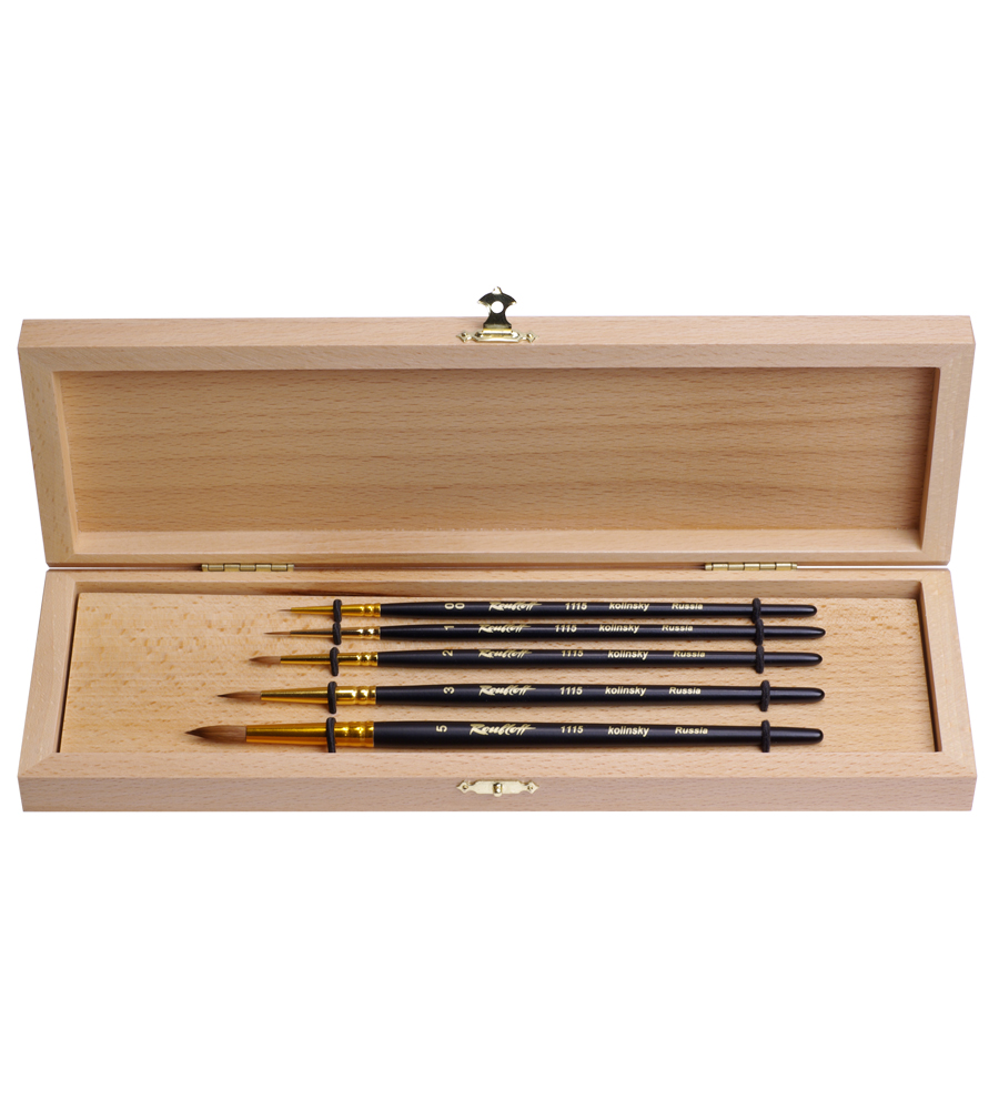 Комплектация: в набор входит 5 круглых кистей из волоса колонка (№00, 1, 2, 3, 5). Набор упакован в подарочную коробку из бука.