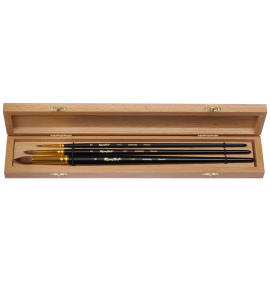 Комплектация: данный набор укомплектован кистями, изготовленными из волоса колонка. В набор входит 3 круглые кисти (№2, №5 и №9). Набор упакован в деревянную шкатулку.