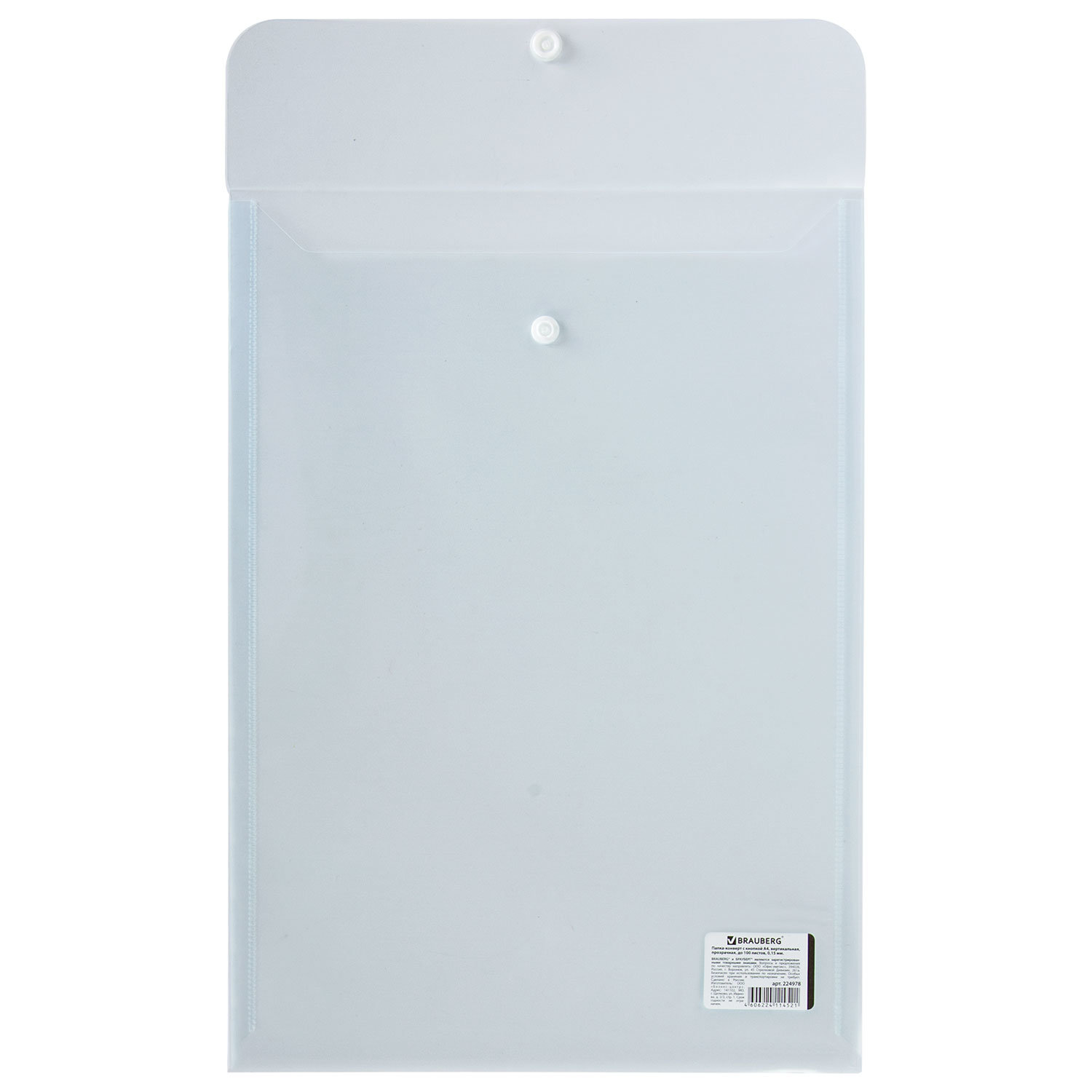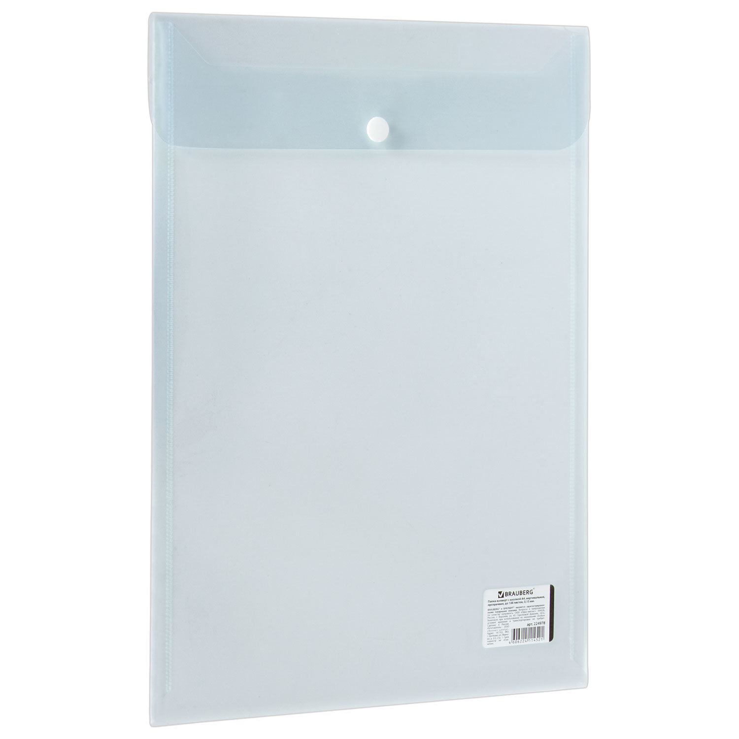 Папка-конверт с гладкой фактурой формата А4 изготовлена из плотного прозрачного пластика толщиной 150 мкм. Закрывается на защелку-кнопку, что делает удобным частое использование и обеспечивает быстрый доступ к ее содержимому. Папка способна вместить до 100 листов стандартной плотности.