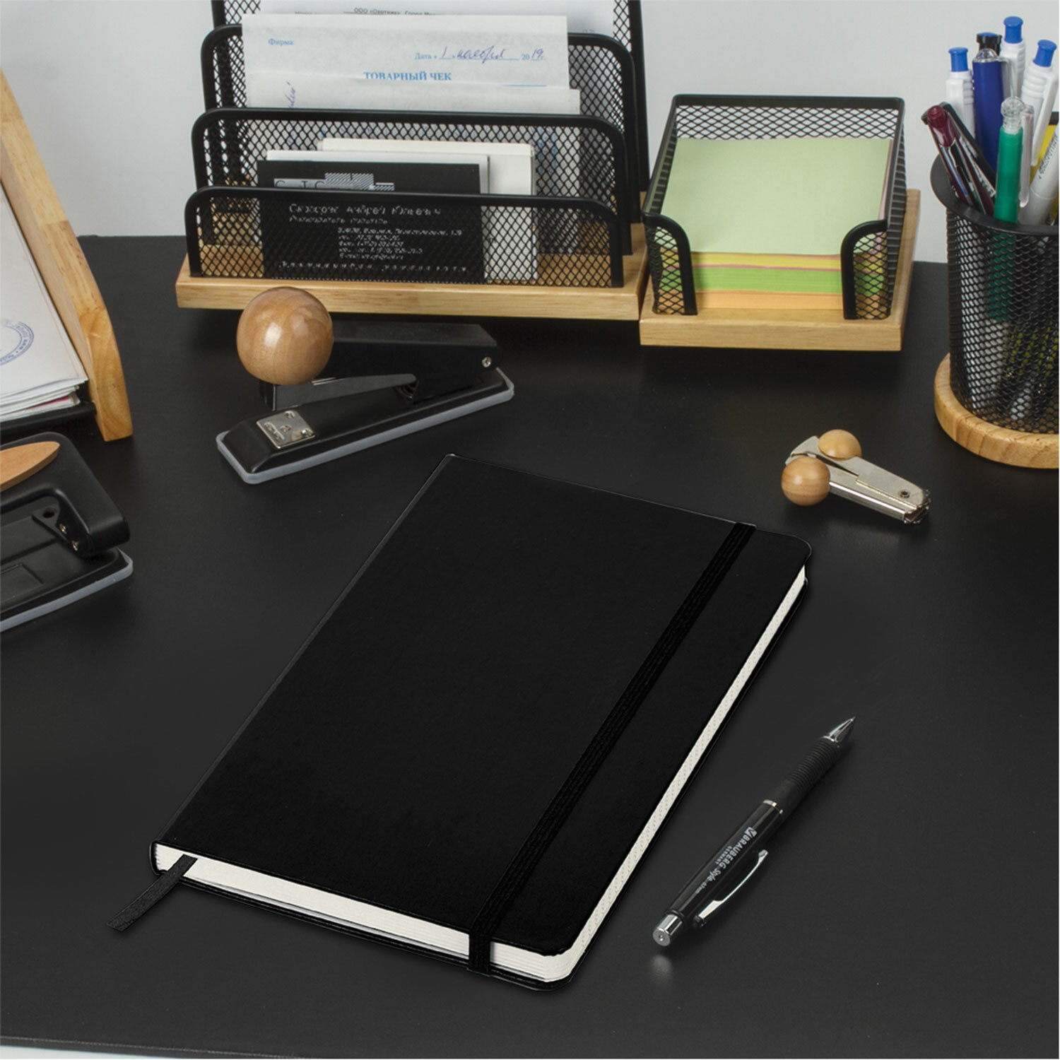Твердая обложка стилизована под "классическую кожу". Имеет закругленные уголки, подходит для горячего тиснения и имеет резинку-фиксатор, благодаря чему не раскроется в сумке или портфеле и листы не помнутся. На внутренней стороне задней обложки есть декоративный конверт для разных мелочей в виде визиток, напоминалок или других милых и полезных мелочей. 96 листов позволят зафиксировать большой объем информации. Блок без линовки дает возможность аккуратно заполнить цифровые значения, вести записи, а также нанести чертежные и художественные зарисовки. Внутренний блок выполнен из офсета цвета слоновой кости плотностью 80 г/м2 и крепится к обложке с помощью книжного переплета. Дополнением является закладка-ляссе, с помощью которой при необходимости можно быстро открыть нужную страницу. Формат блокнота А5 (130х210 мм) позволит владельцу поместить его в кейс или сумку малых габаритов.