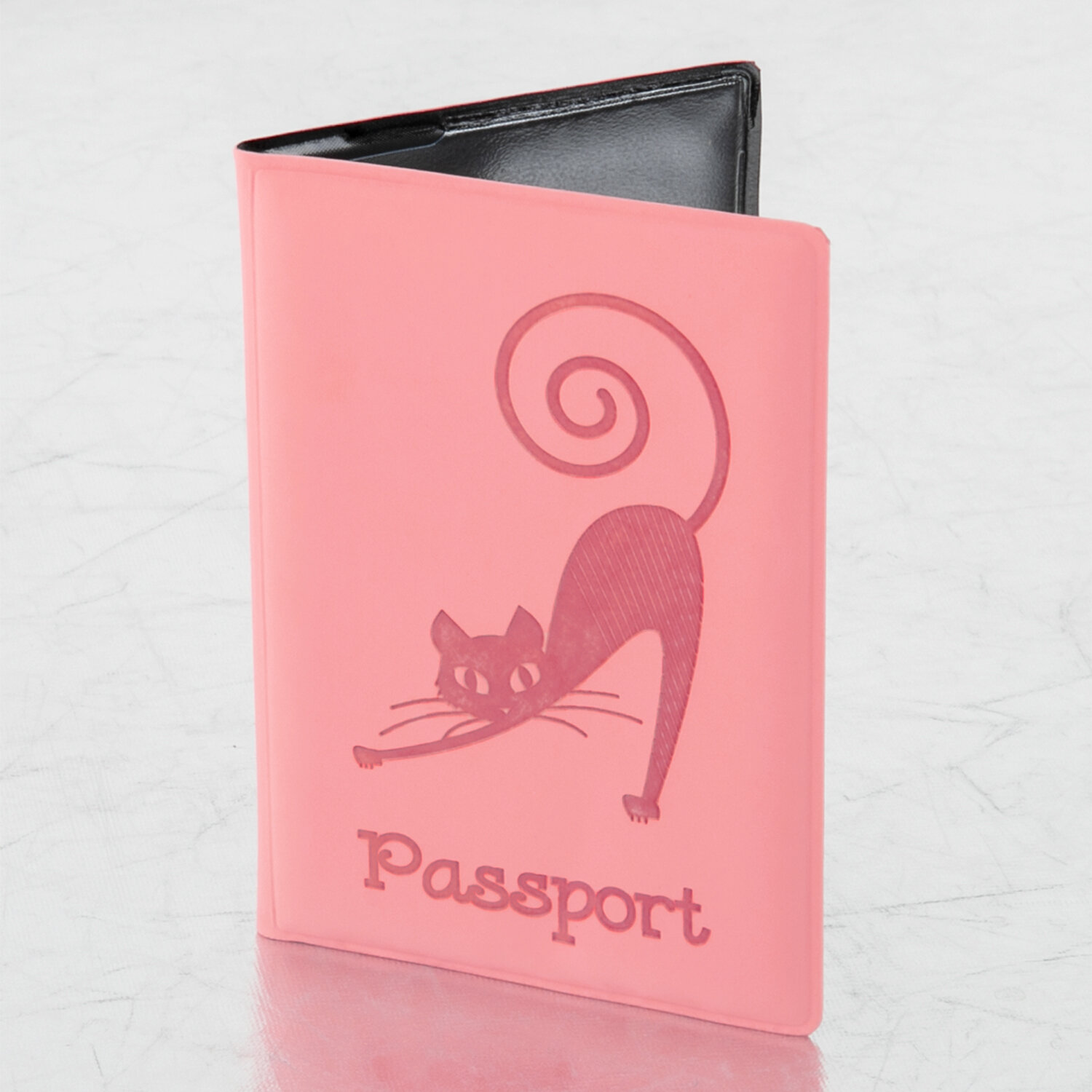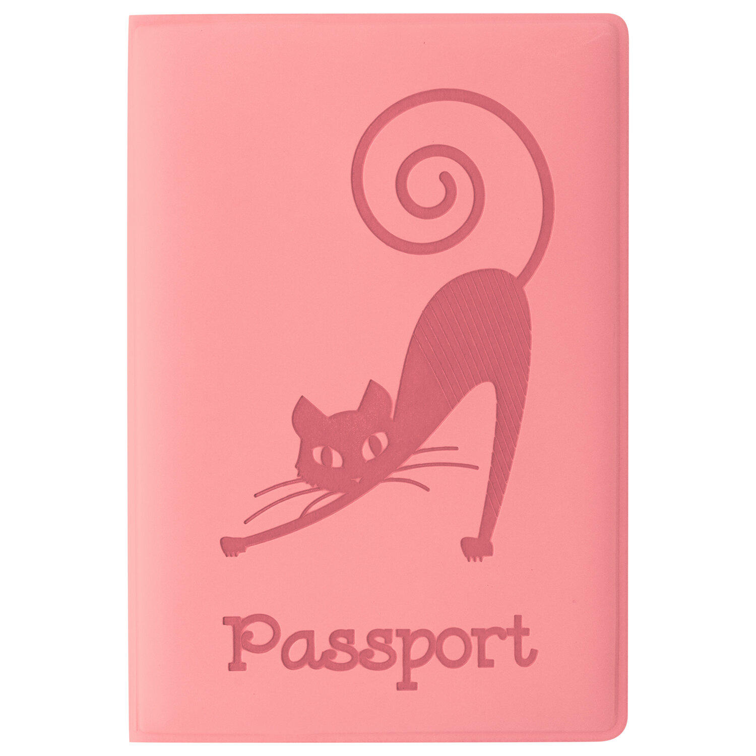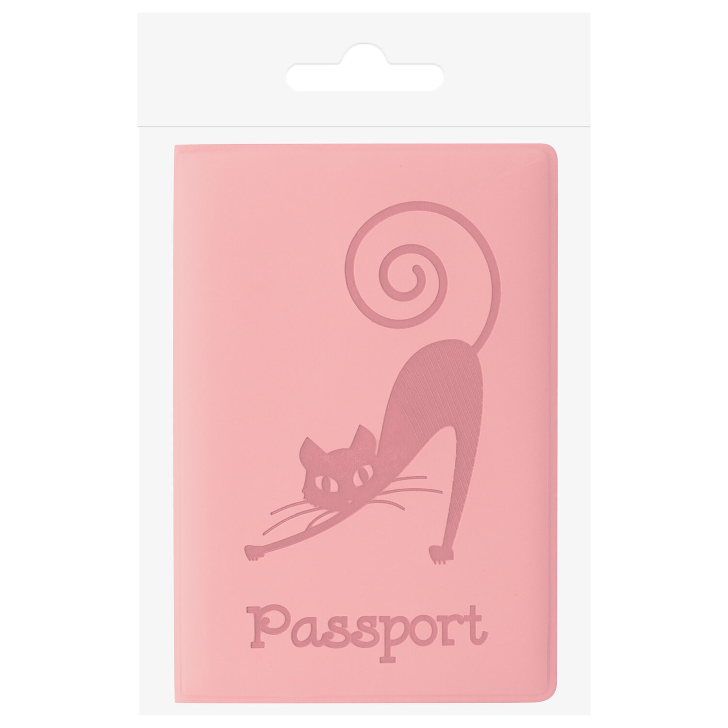 Модель выполнена из мягкого полиуретана яркого персикового цвета, украшена изящной кошкой и тисненой надписью "Паспорт". На внутреннем развороте расположены два кармана из прозрачного пластика. Благодаря компактным размерам 97х138 мм удобно всегда носить с собой.