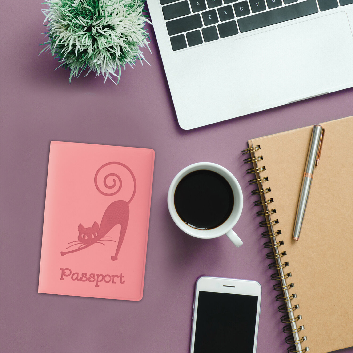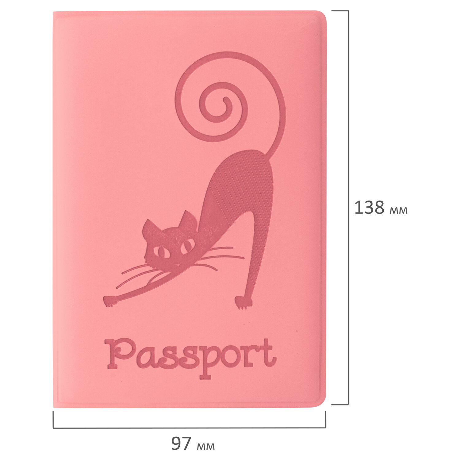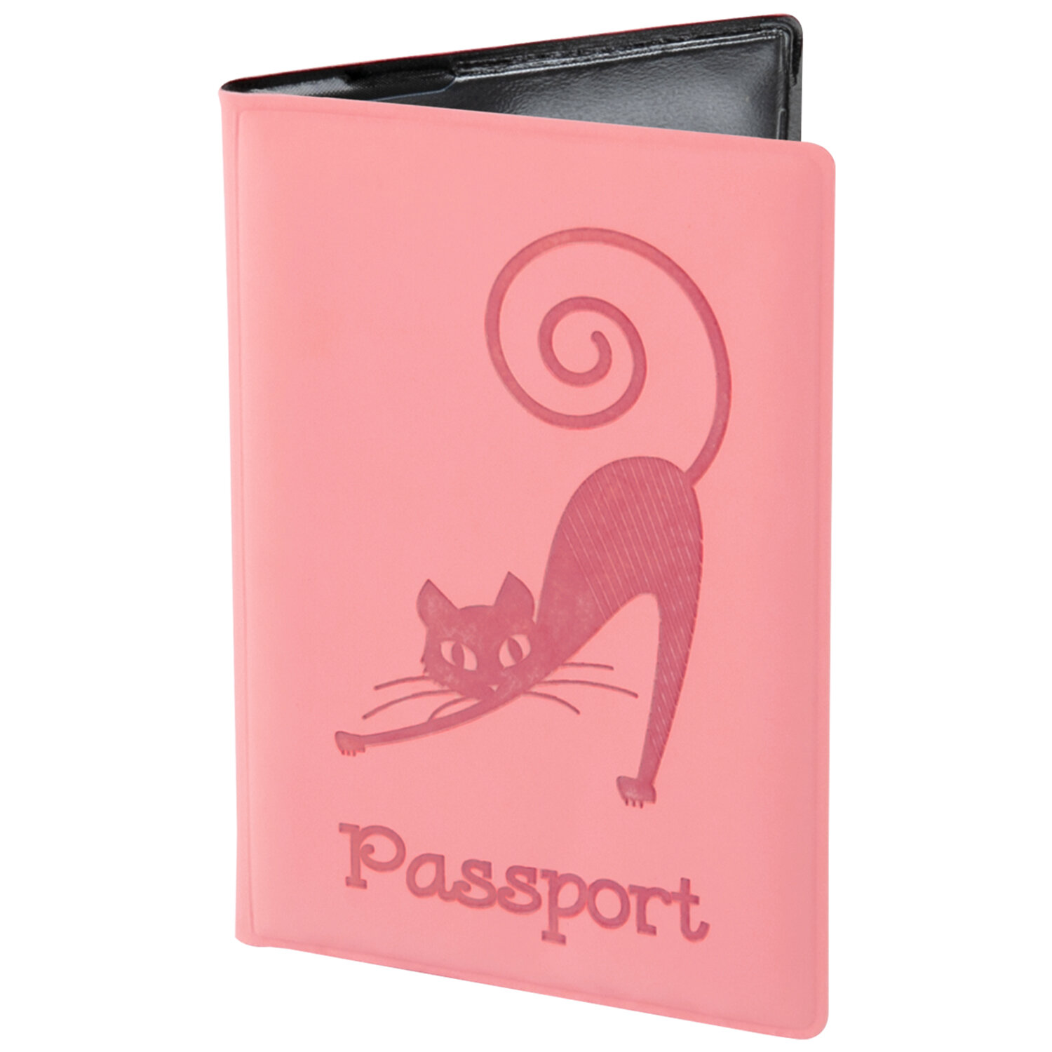Модель выполнена из мягкого полиуретана яркого персикового цвета, украшена изящной кошкой и тисненой надписью "Паспорт". На внутреннем развороте расположены два кармана из прозрачного пластика. Благодаря компактным размерам 97х138 мм удобно всегда носить с собой.
