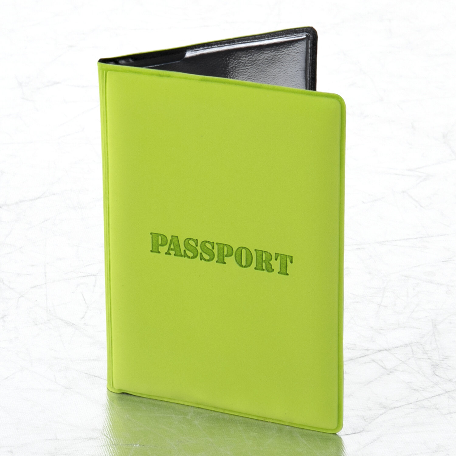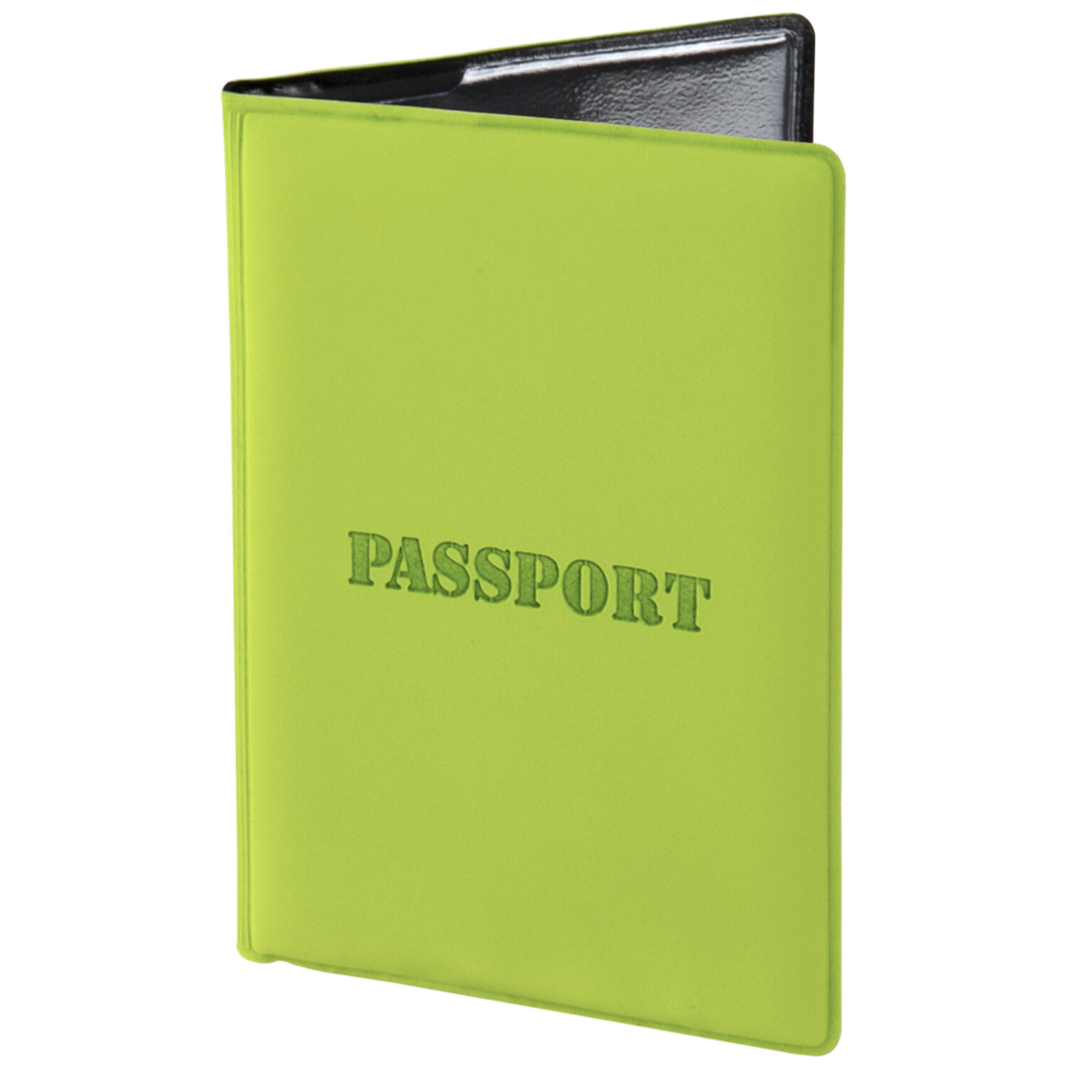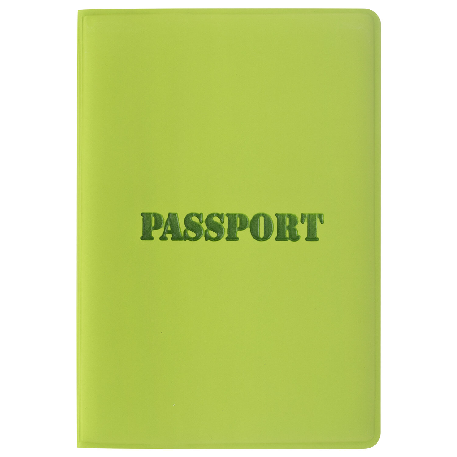 Модель выполнена из мягкого полиуретана яркого cалатового цвета, украшена тисненой надписью "Паспорт". На внутреннем развороте расположены два кармана из прозрачного пластика. Благодаря компактным размерам 97х138 мм удобно всегда носить с собой.