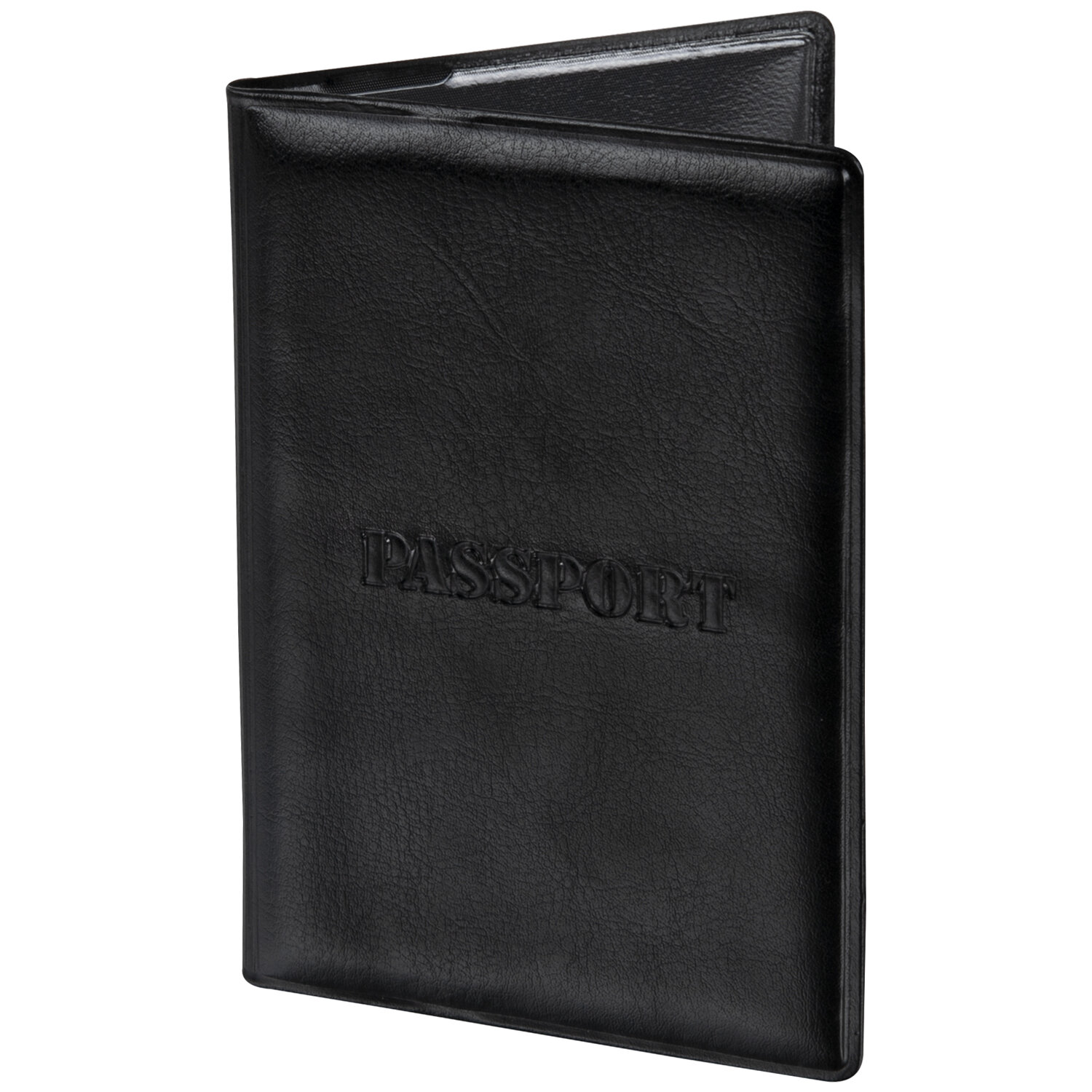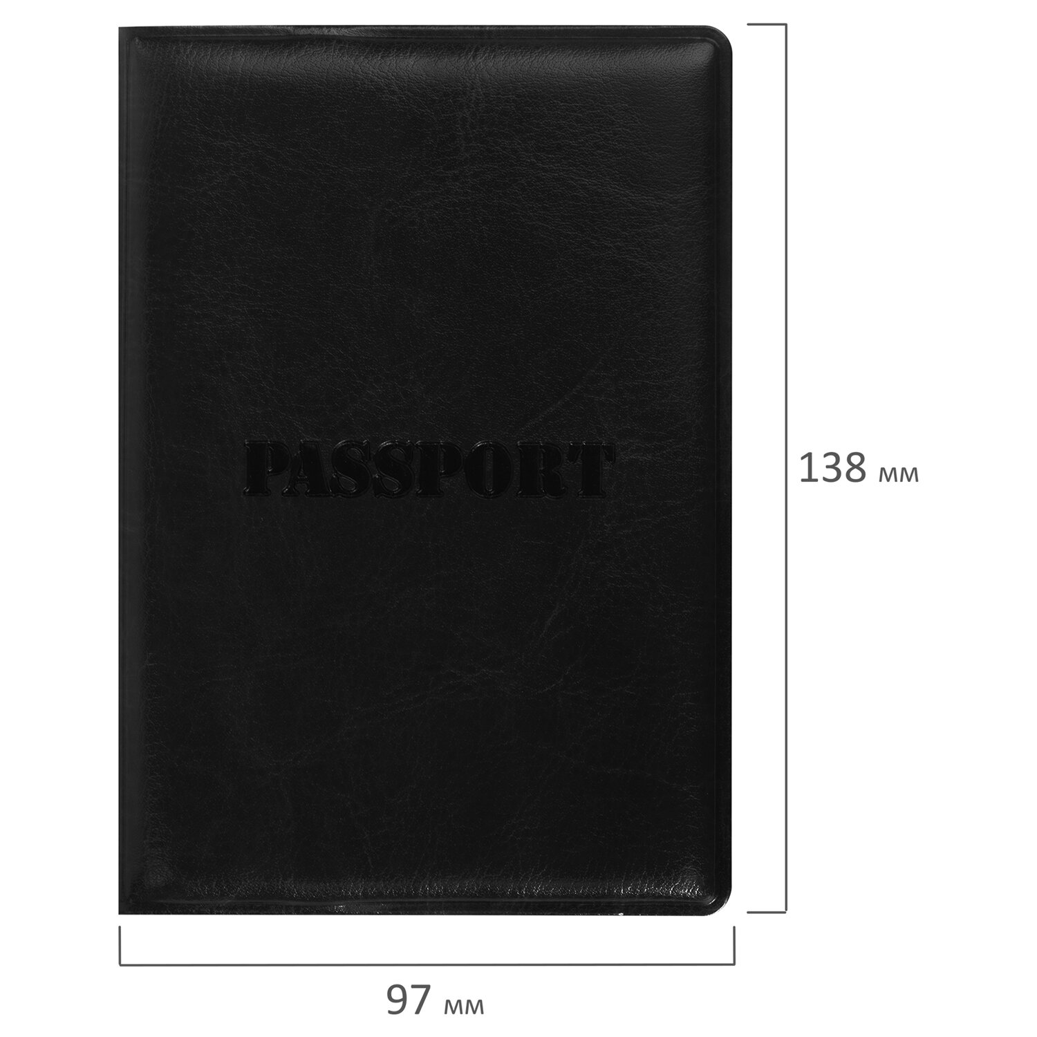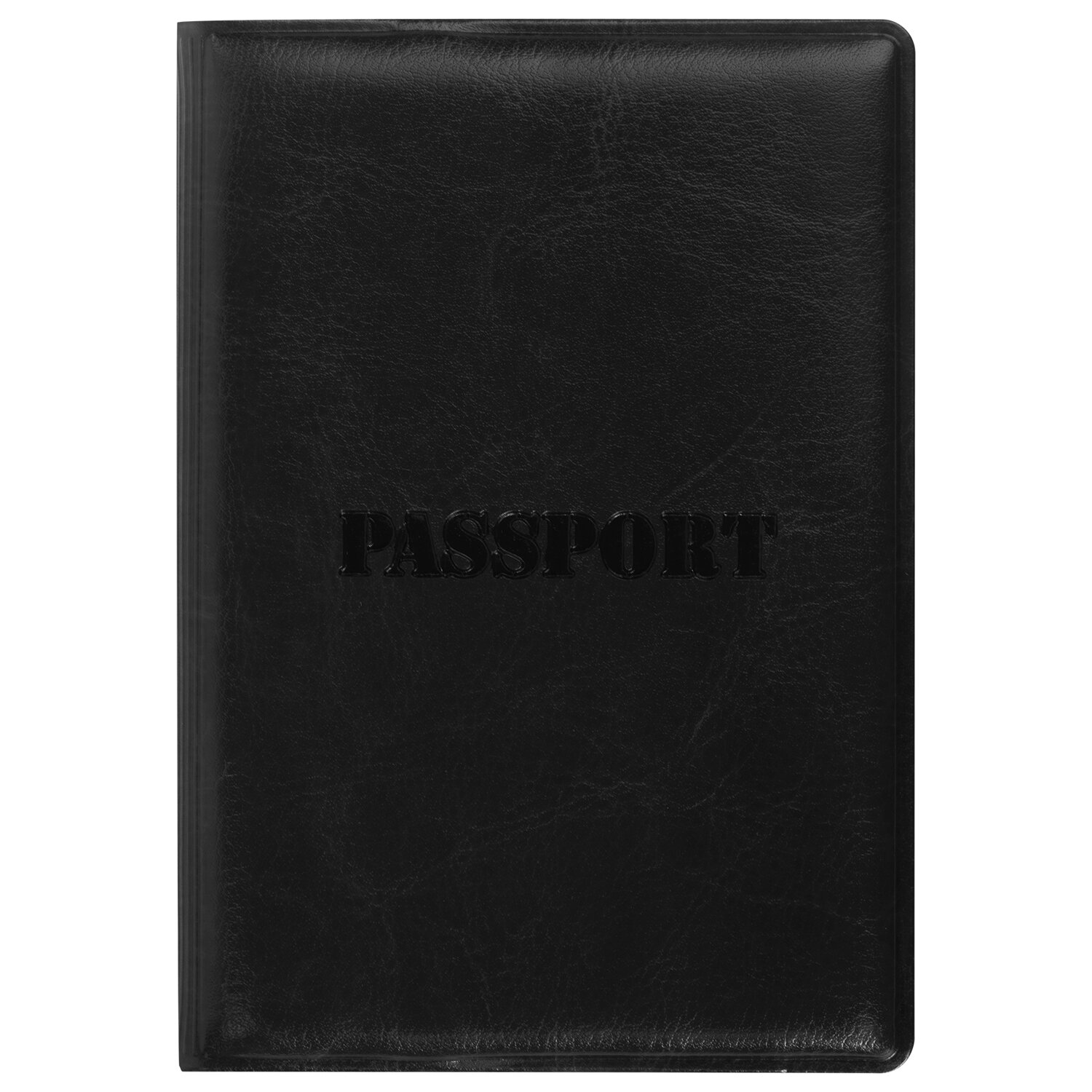 Модель выполнена из полиуретана, напоминающего кожу черного цвета, и украшена тисненой надписью "Паспорт". На внутреннем развороте расположены два кармана из прозрачного пластика. Благодаря компактным размерам 97х138 мм удобно всегда носить с собой.