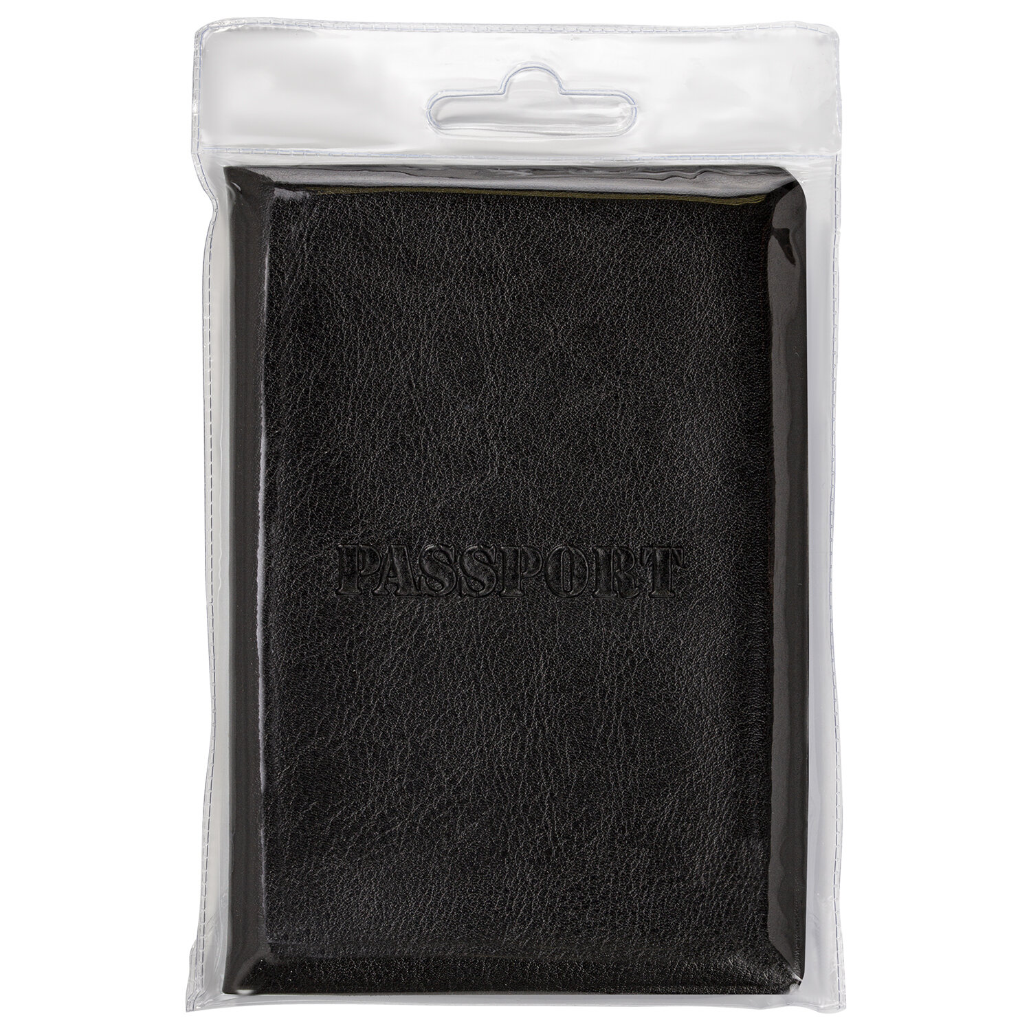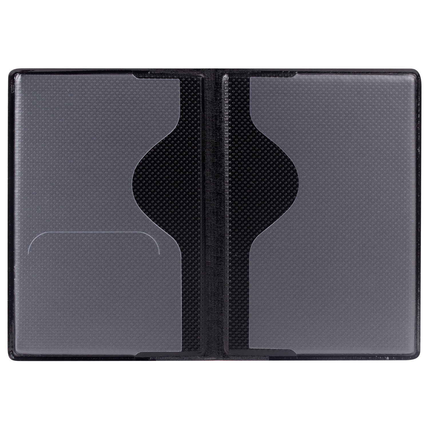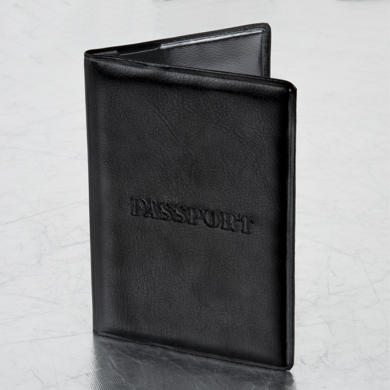 Модель выполнена из полиуретана, напоминающего кожу черного цвета, и украшена тисненой надписью "Паспорт". На внутреннем развороте расположены два кармана из прозрачного пластика. Благодаря компактным размерам 97х138 мм удобно всегда носить с собой.