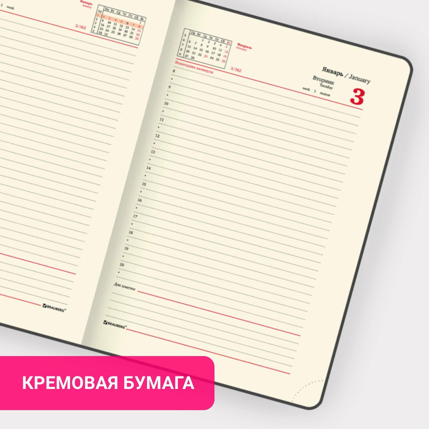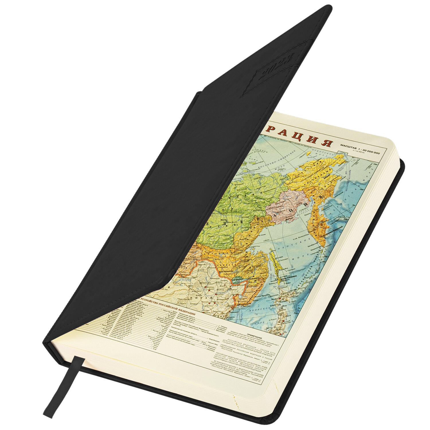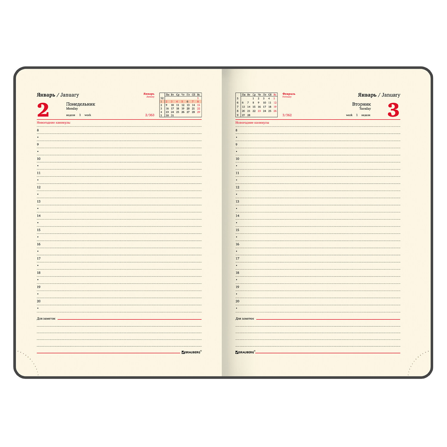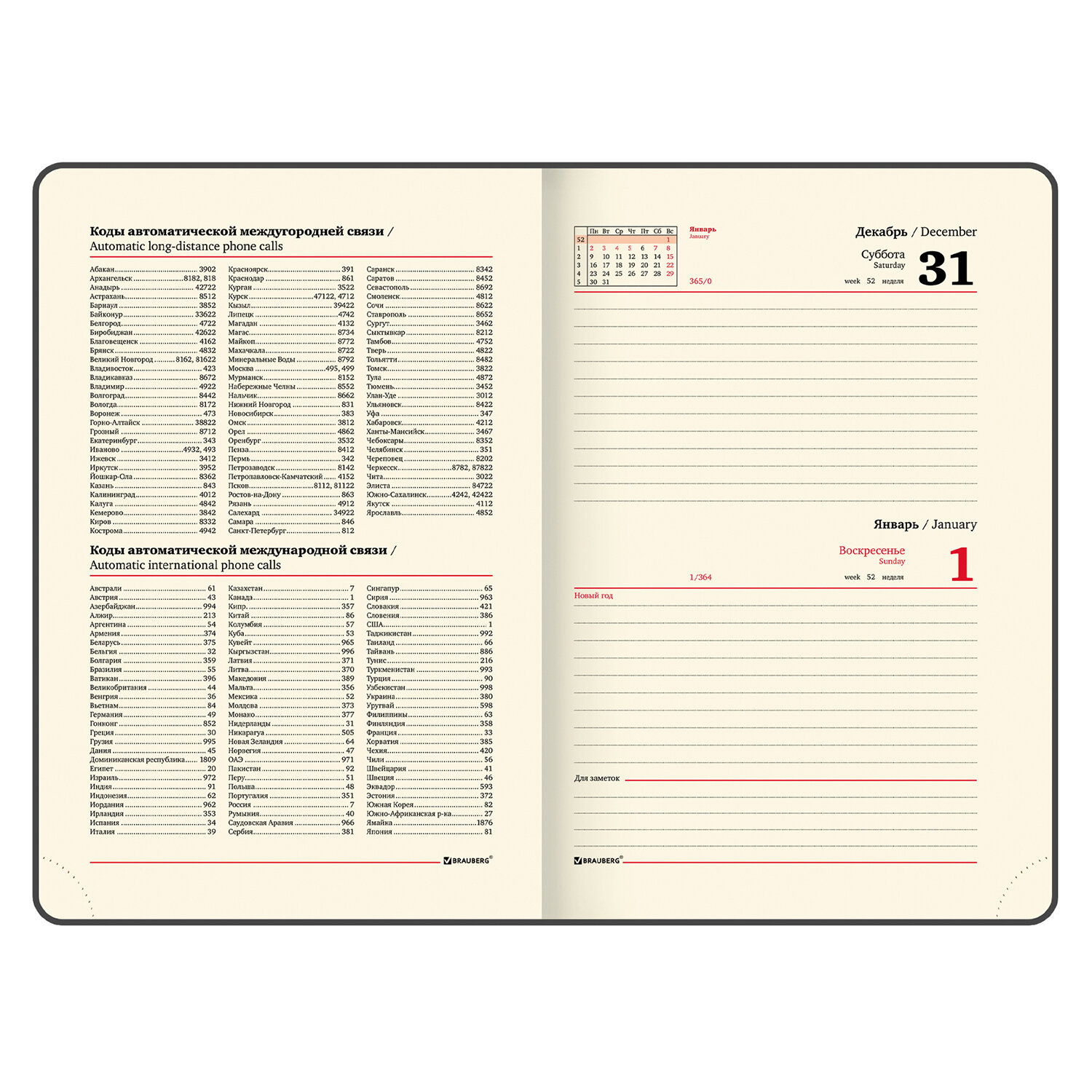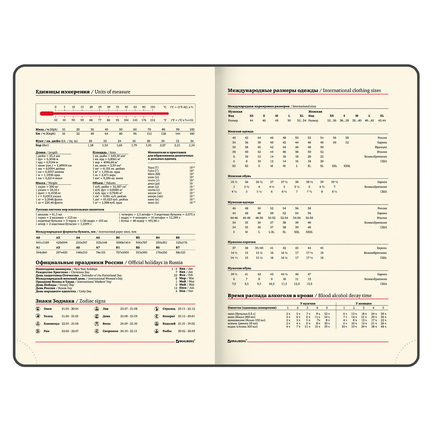Внутренний блок включает 168 листов тонированной бумаги плотностью 70 г/м2. Каждая страничка имеет перфорированный угол. Благодаря стандартному формату А5 (138х213 мм) ежедневник удобно использовать как в офисе, так и на выездных деловых встречах. Твердая обложка стилизована под гладкую кожу строгого черного цвета. Материал обложки подходит для горячего тиснения. Форзац ежедневника представлен картами мира и России. Дополнением является закладка-ляссе, с помощью которой при необходимости можно быстро открыть ежедневник на нужной странице. Помимо прочего, ежедневник снабжен обширным справочным материалом.Датированный ежедневник BRAUBERG "Imperial" идеально подойдет для офисных работников и людей, занимающихся бизнесом, ценящих свое драгоценное время.