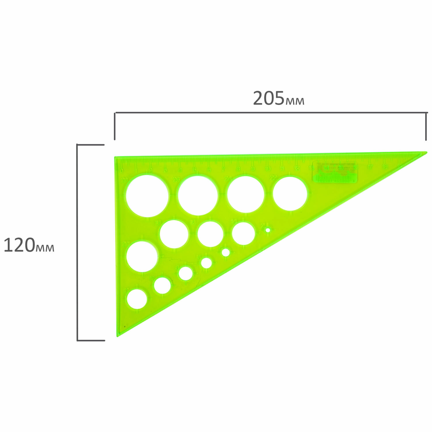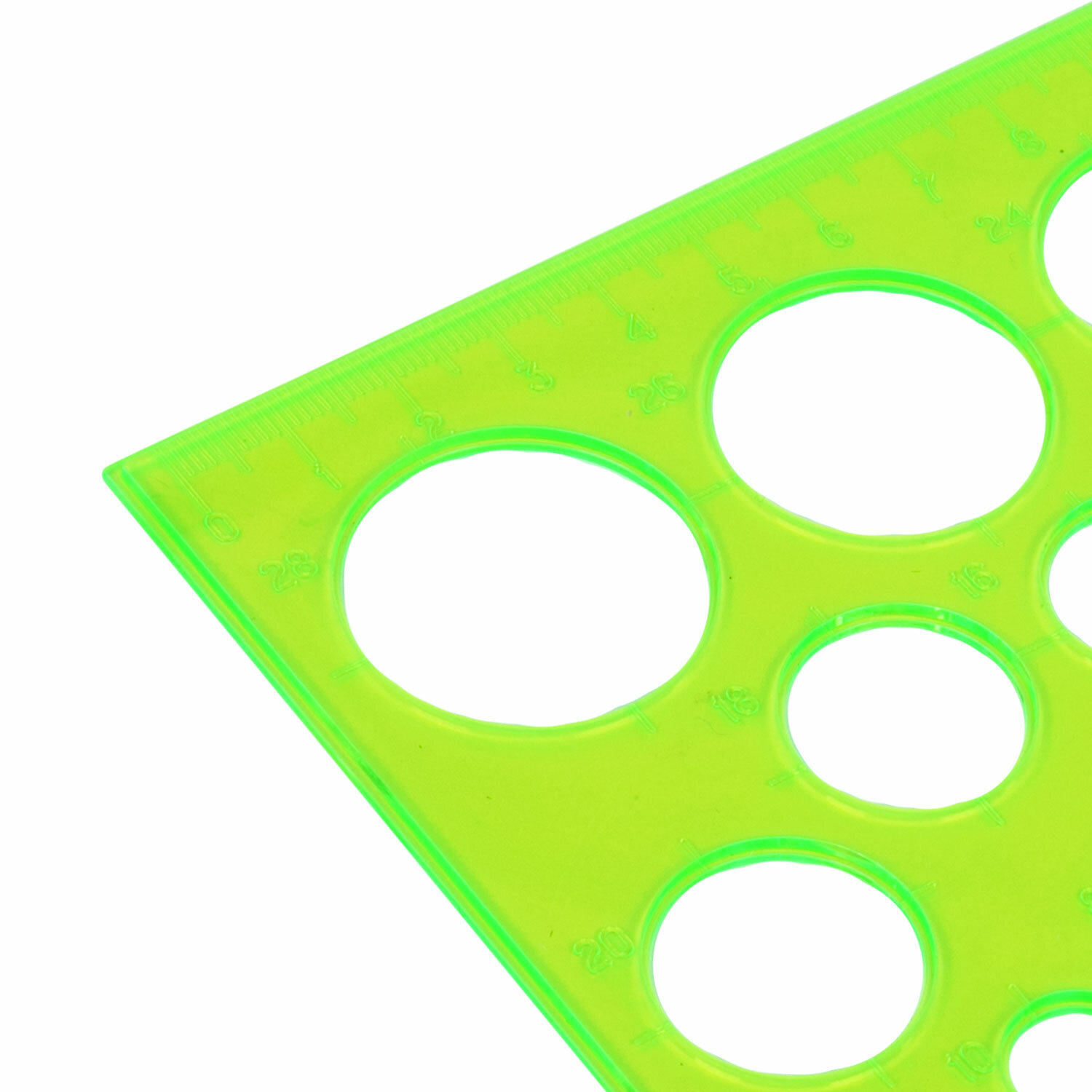 Изготовлен из прочного прозрачного неонового пластика толщиной 2 мм. Длина шкалы - 19 см, угол - 30°, трафареты 14 окружностей диаметром от 2 до 28 мм. Обладает четкой печатной разметкой. Размер - 12,5 х 21,5 см. Цвет - ассорти. Поставляется без упаковки.