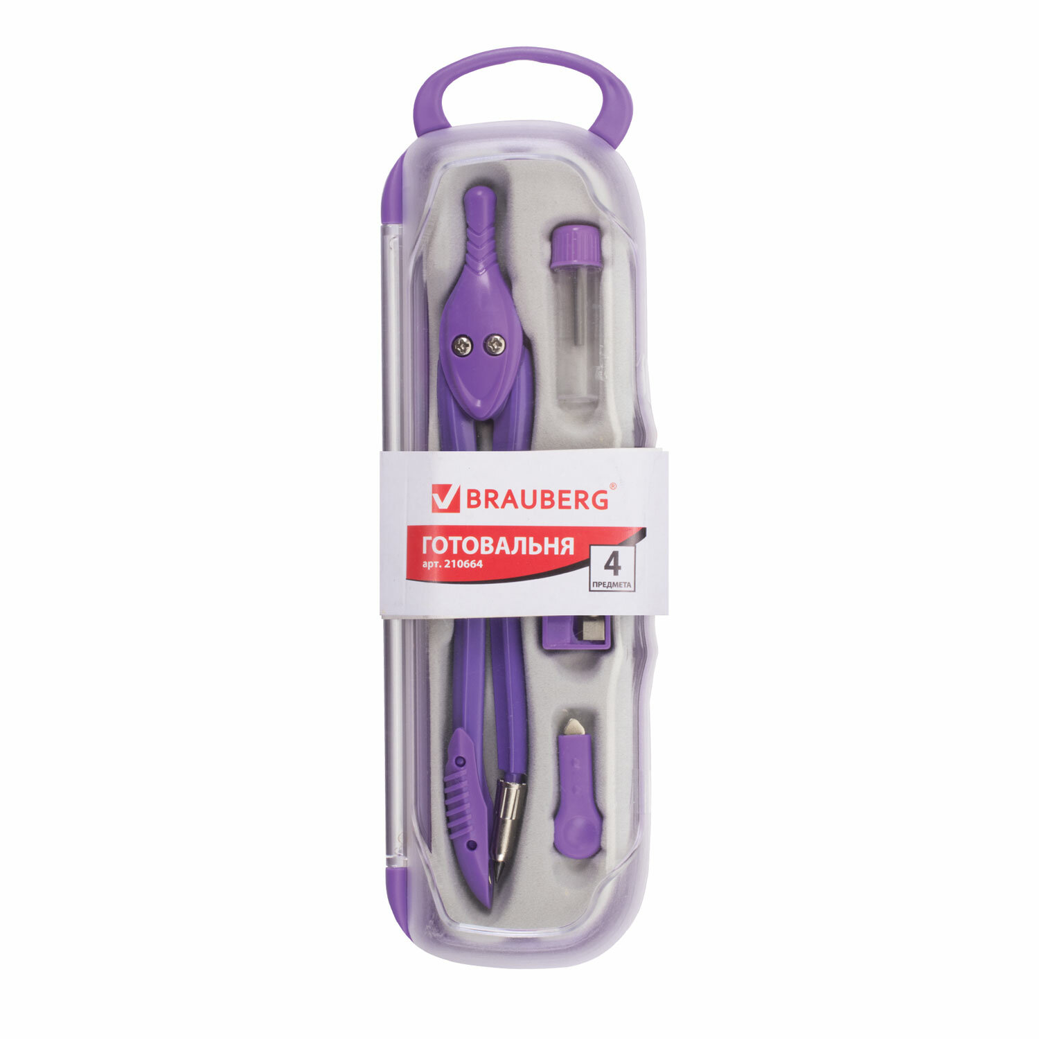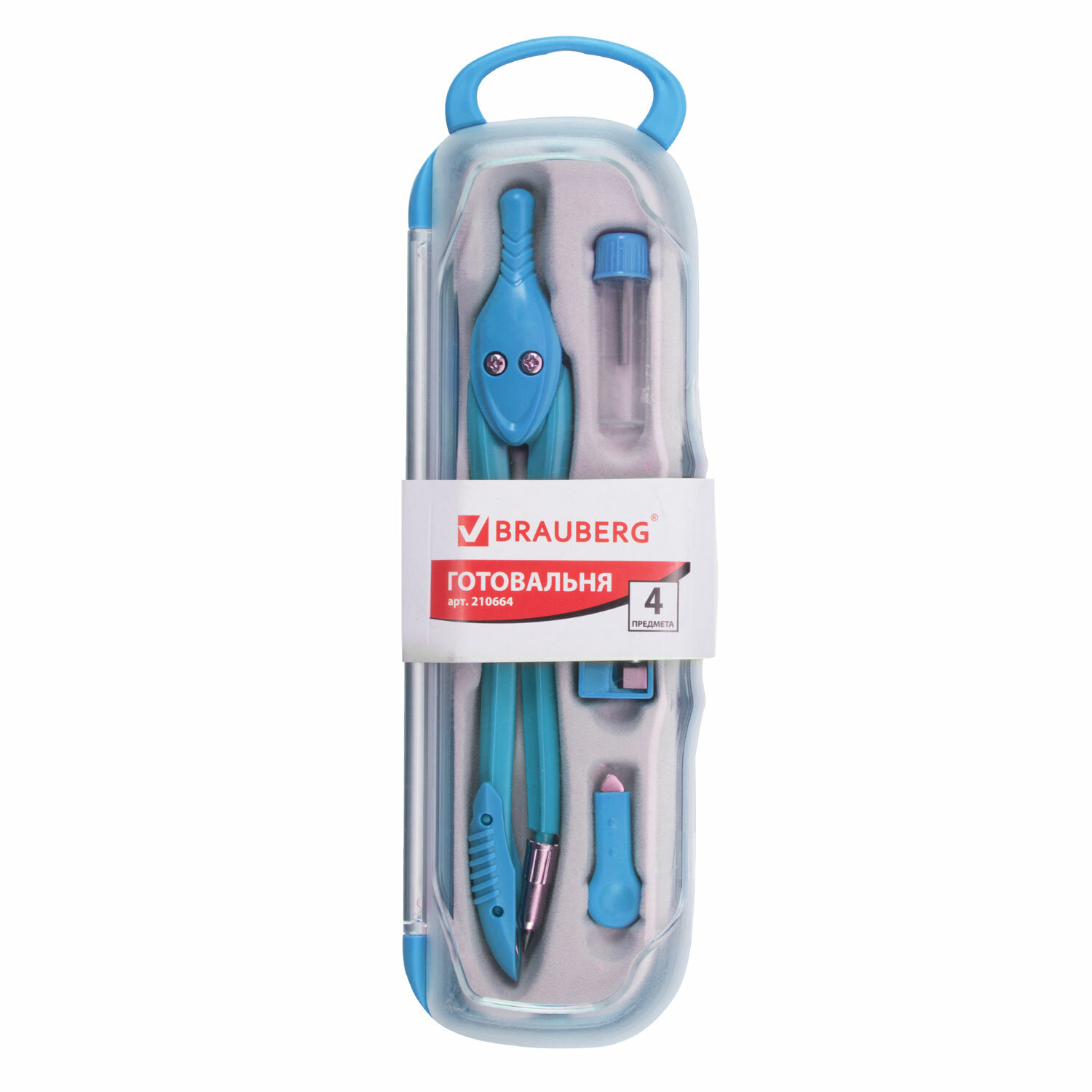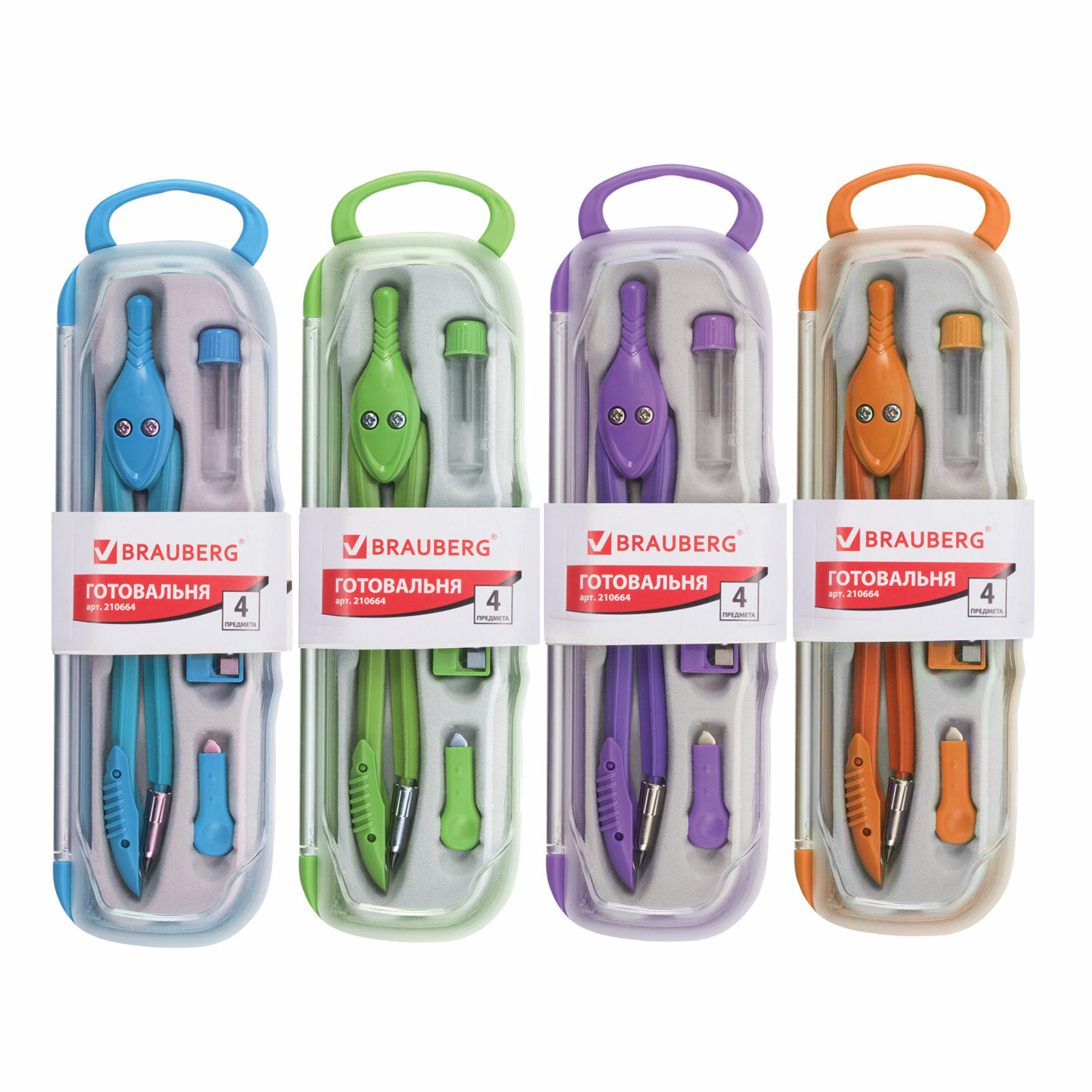 В состав готовальни входят 4 предмета:- циркуль;- точилка;- отвертка;- пенал с запасным грифелем.Циркуль длиной 135 мм имеет несгибаемые штанги и пластиковый защитный колпачок для иглы. Изготовлен из металла. Цвет - ассорти (без возможности выбора цвета).Поставляется в пластиковом пенале с европодвесом.