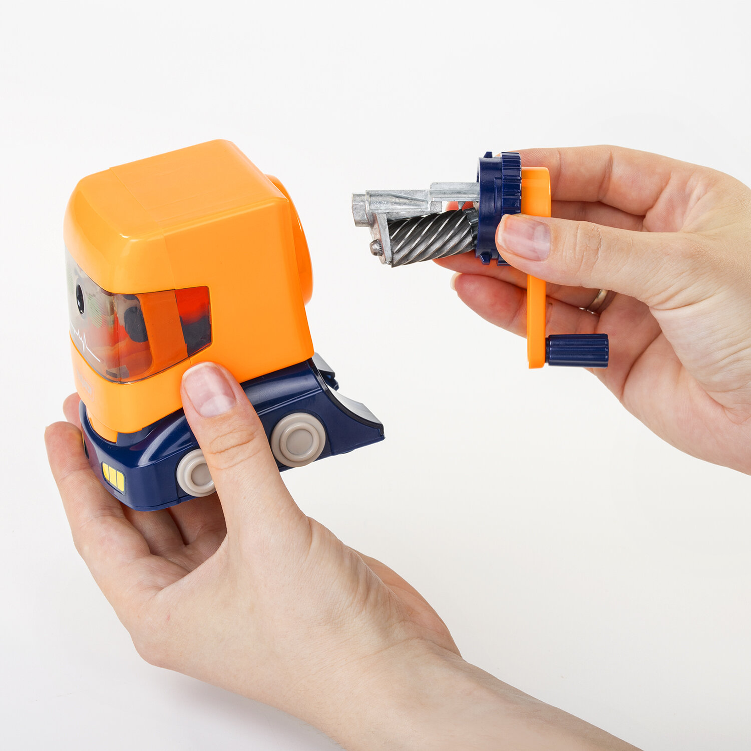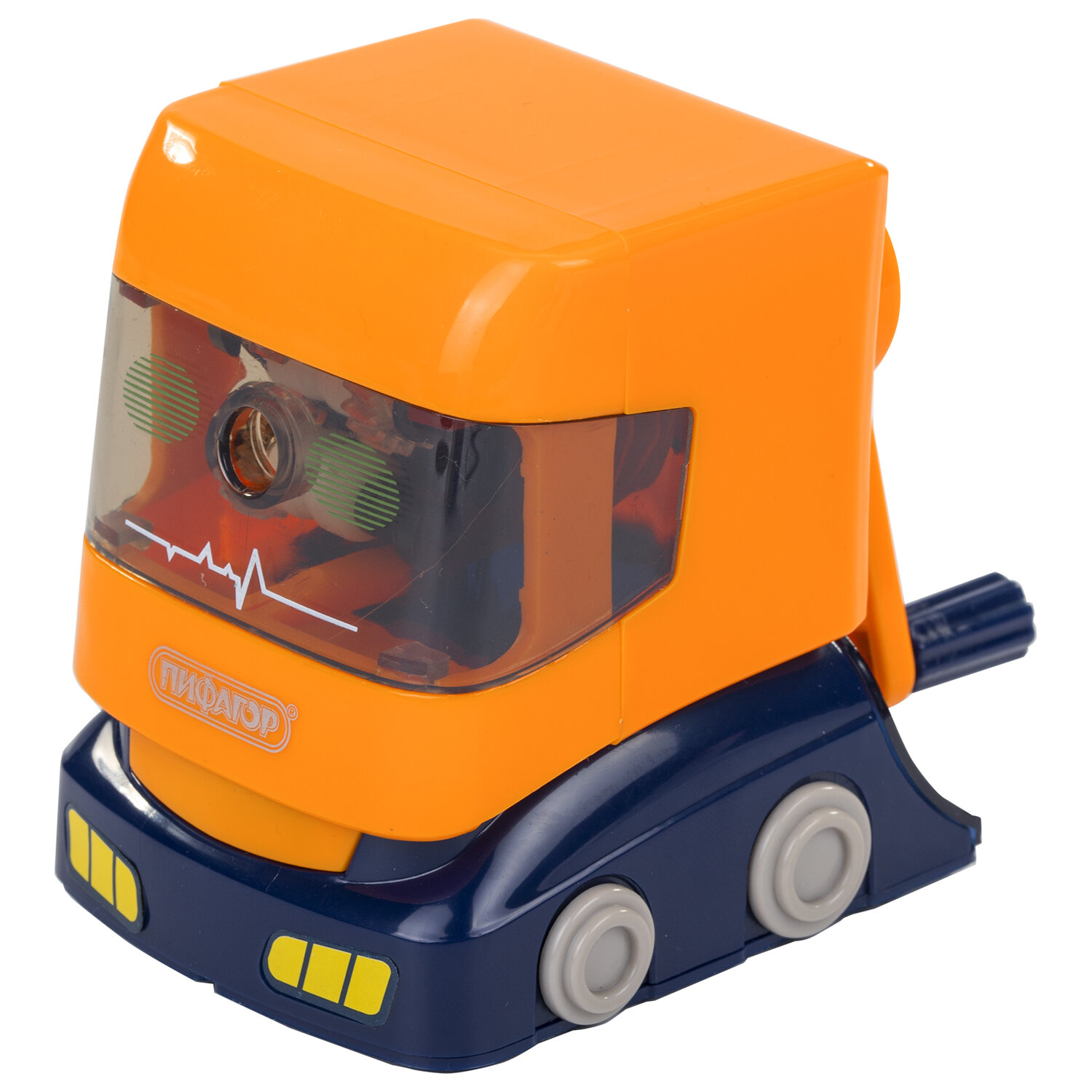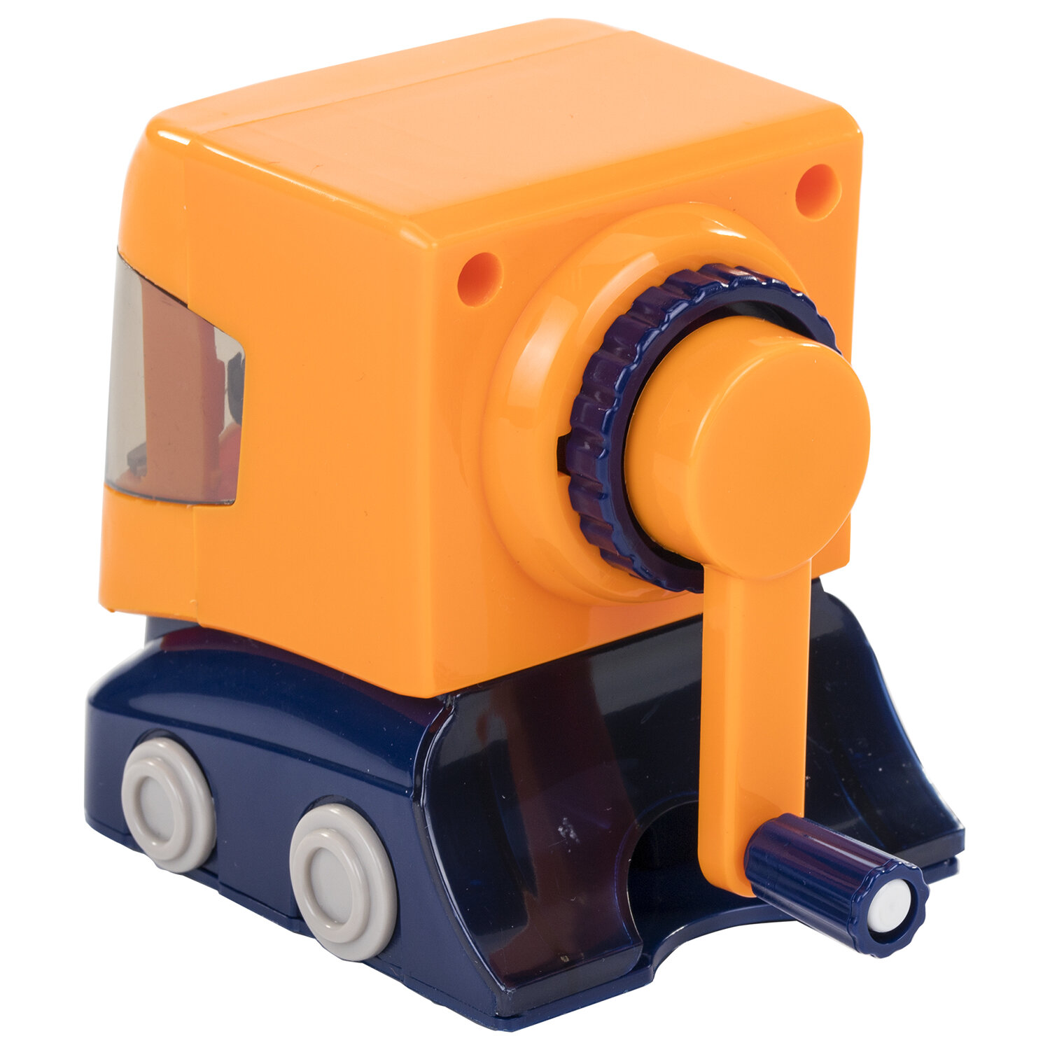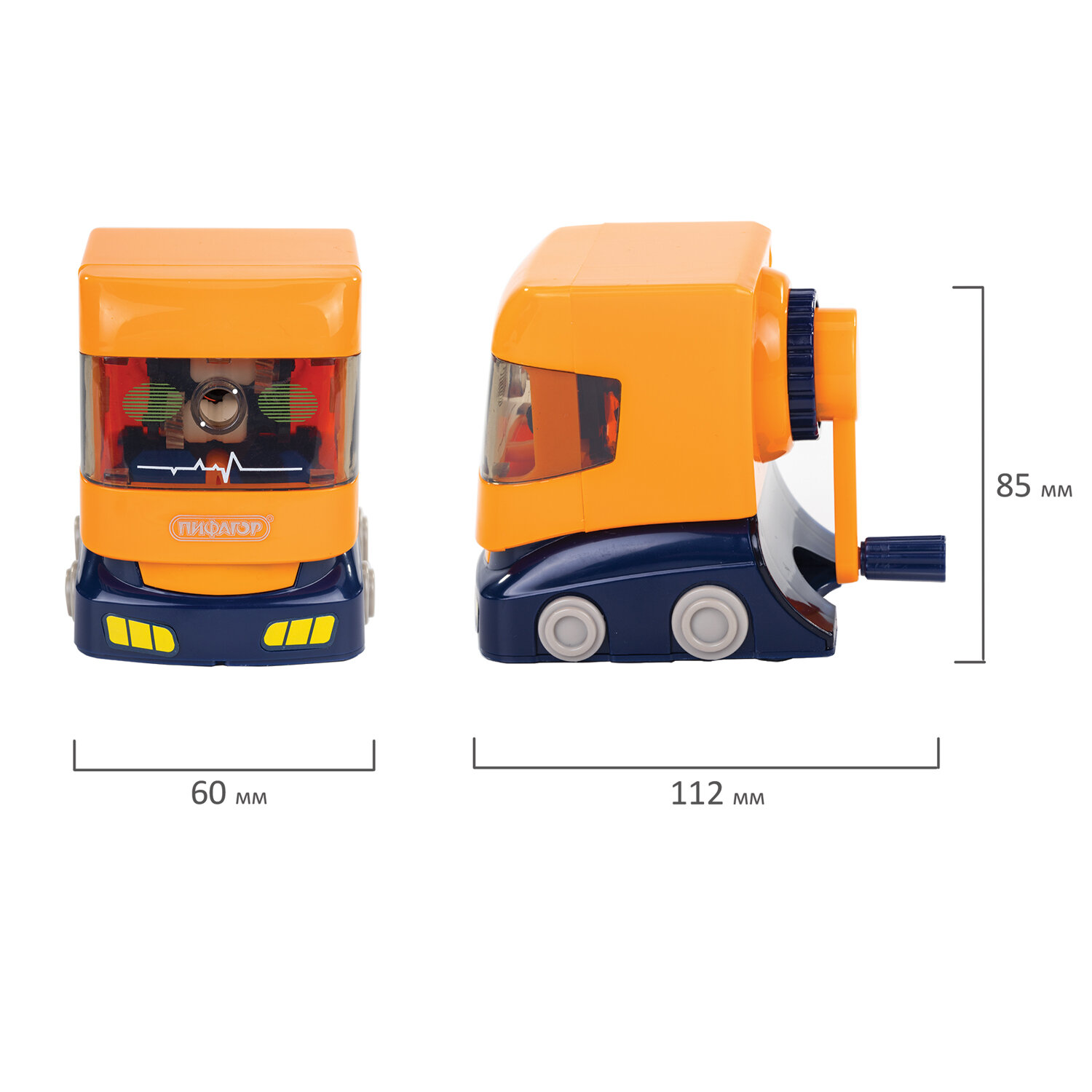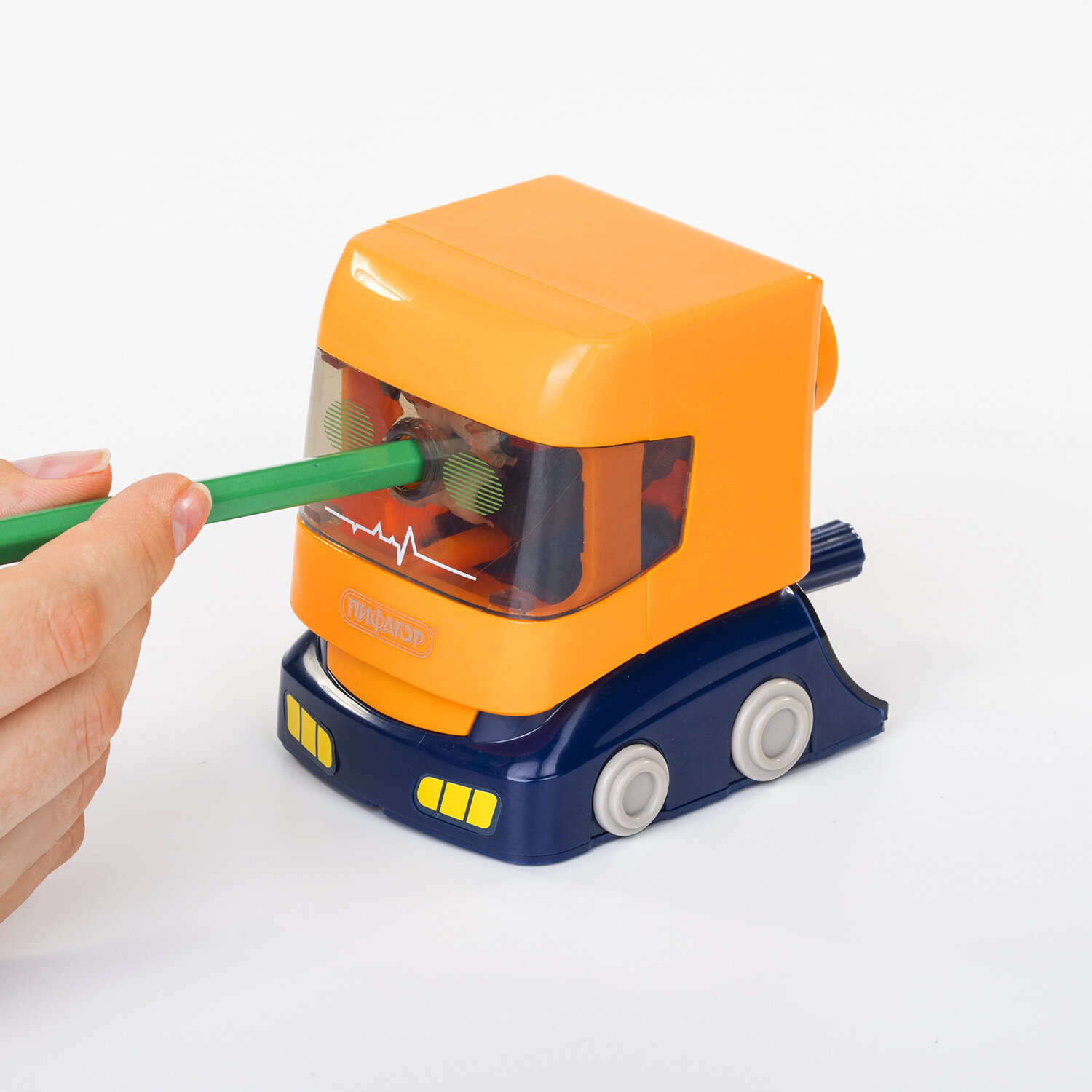 Корпус точилки выполнен из пластика. Вращающийся роликовый нож из высококачественной стали обеспечивает быструю и острую заточку. Точилка имеет одно отверстие, сзади расположен вместительный контейнер для сбора стружки. Диаметр затачиваемого карандаша - 8 мм. Размер: 85х60х112 мм.