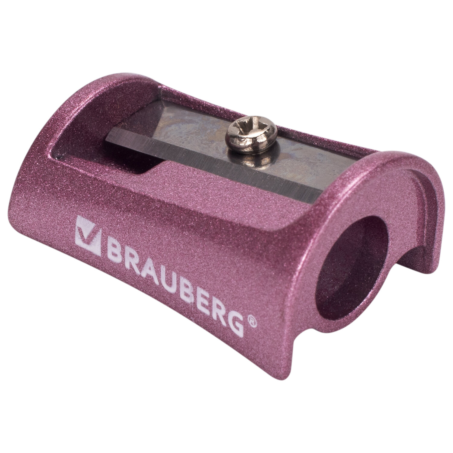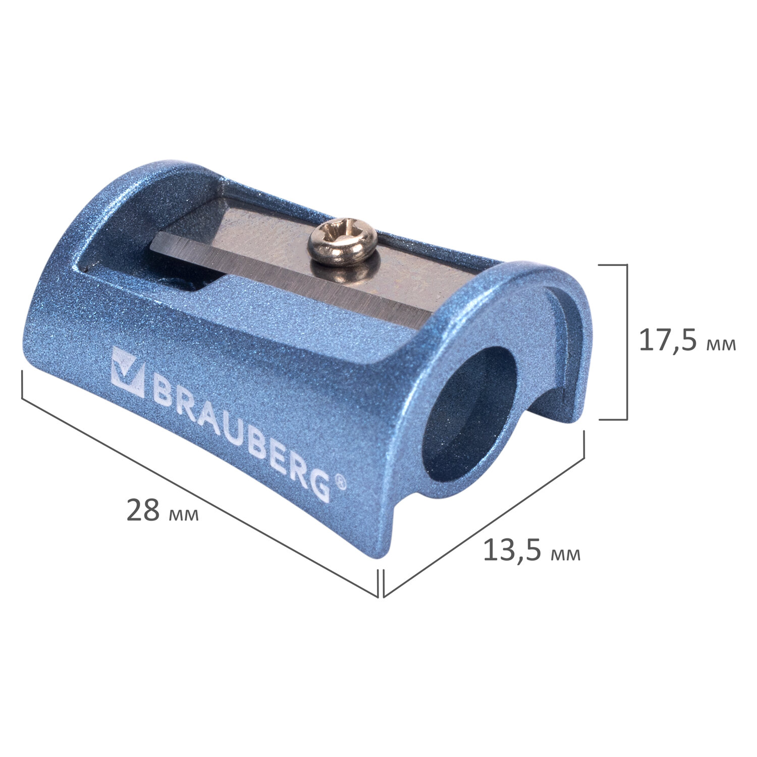 Прочный корпус выполнен из цинка двух цветов ассорти. Эргономичная форма точилки позволяет удобно держать ее в руке. Острое стальное лезвие обеспечивает быструю и легкую заточку. Размер - 28х17,5х13,5 мм.