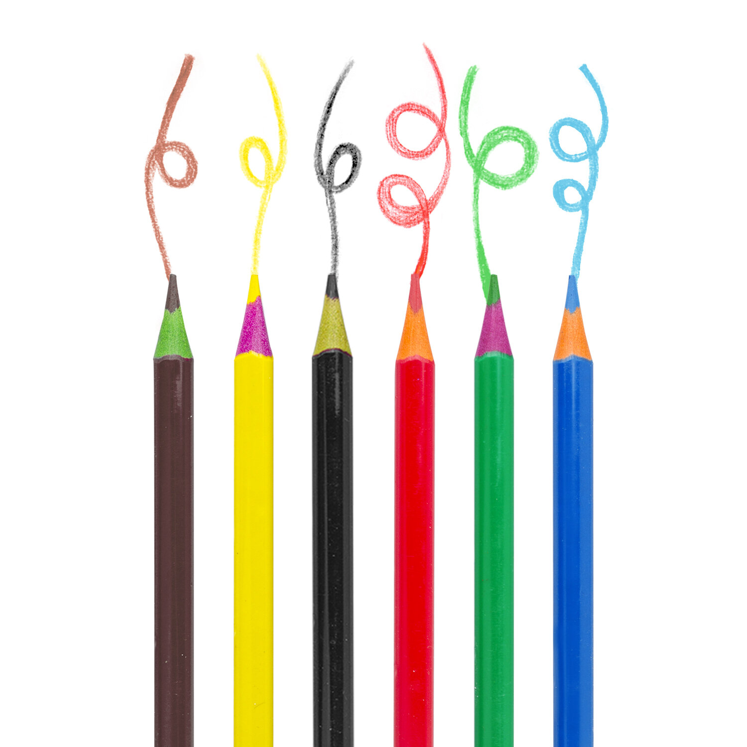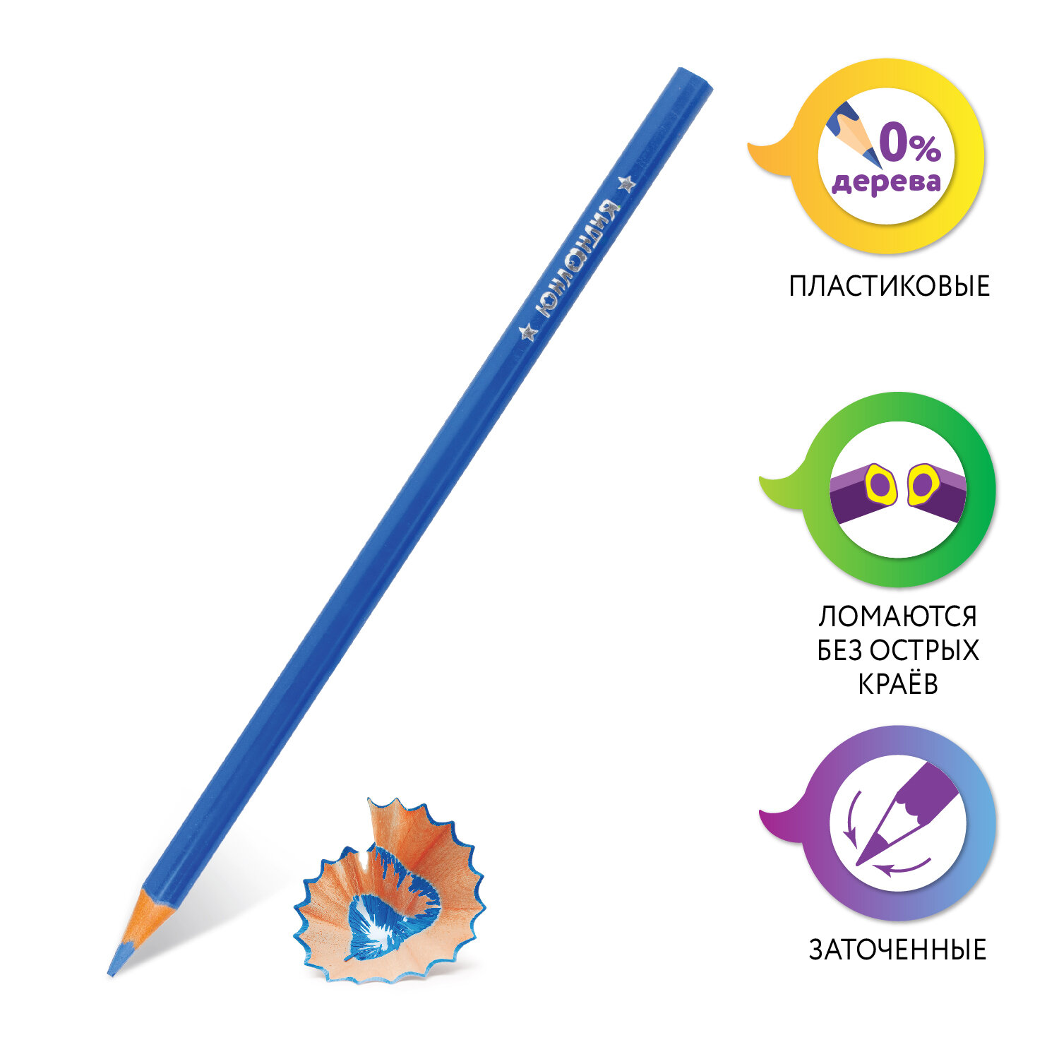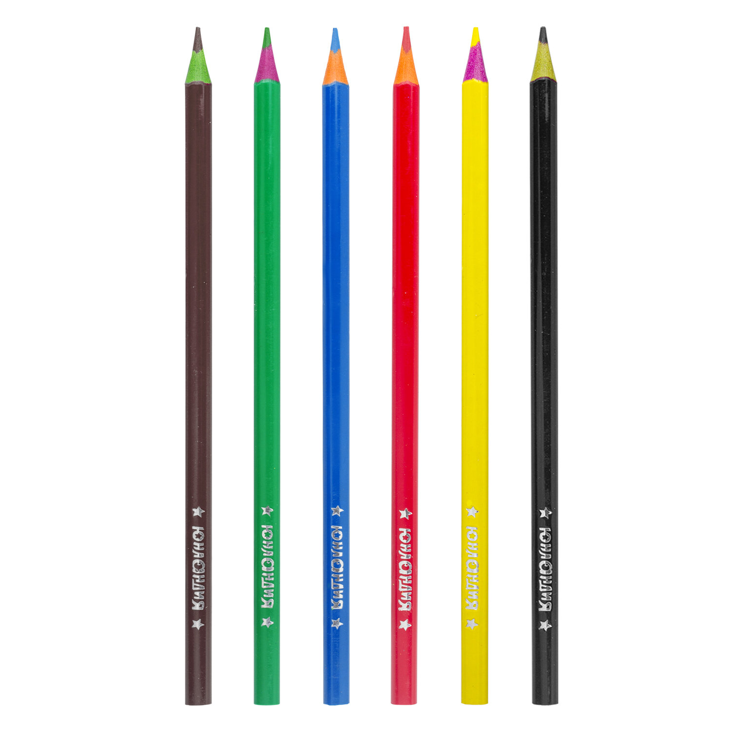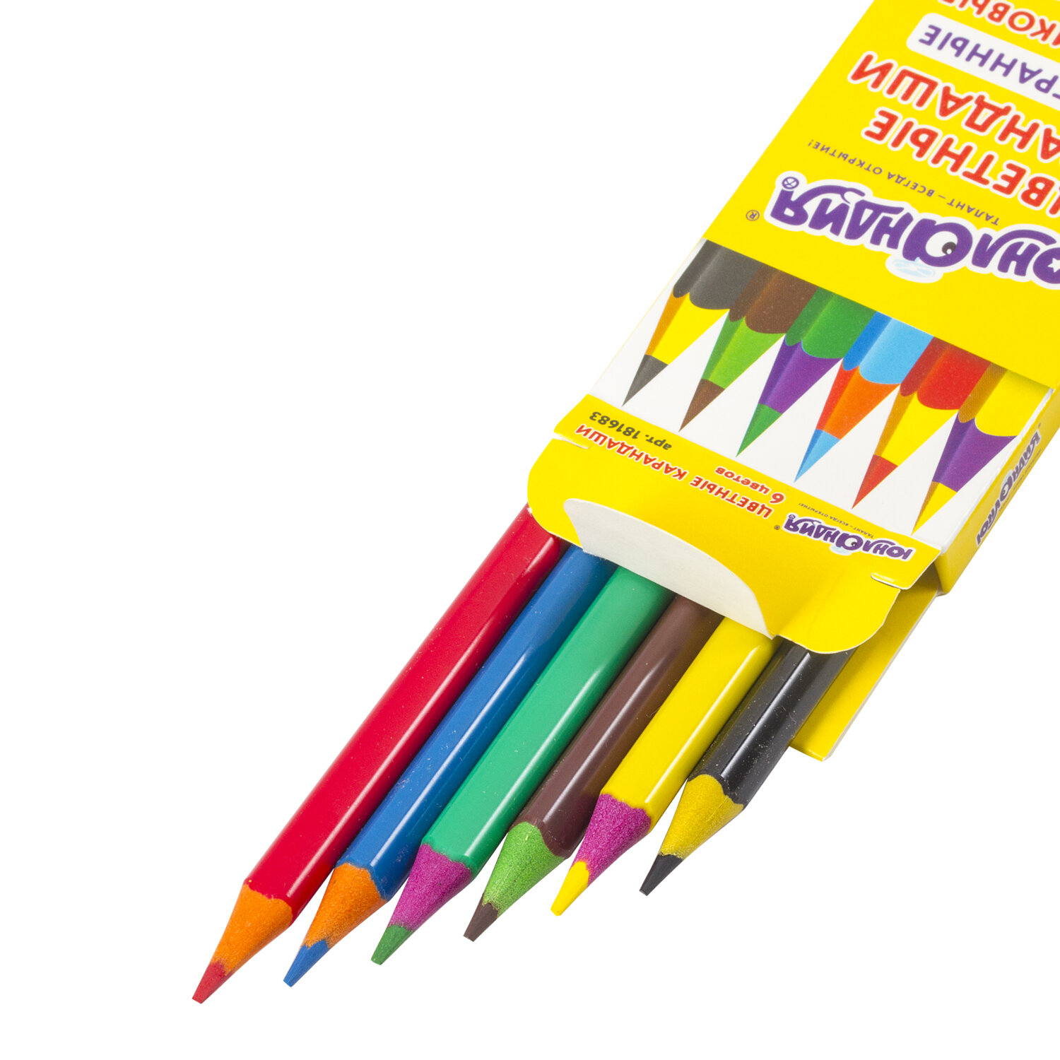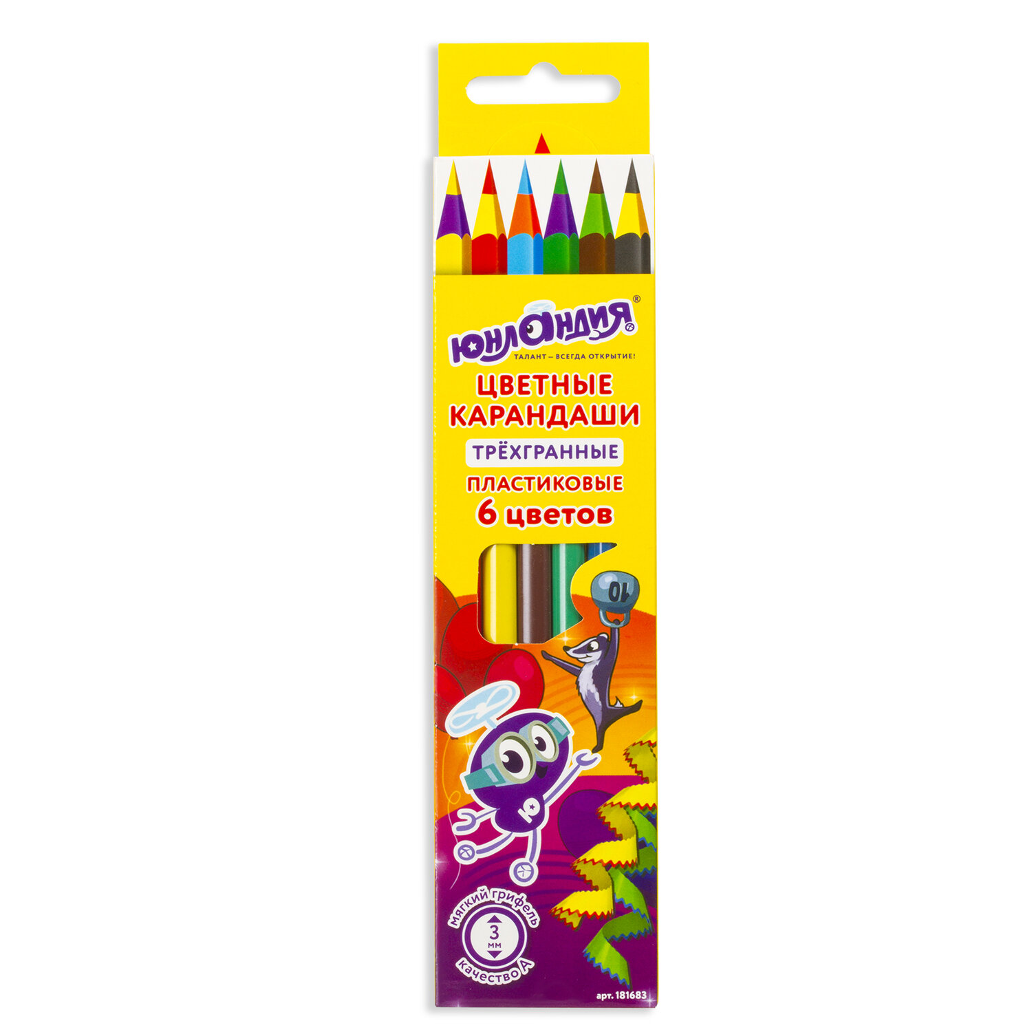 Набор состоит из 6 цветов: красный, желтый, зеленый, голубой, коричневый, черный. Яркие цвета развивают цветовосприятие ребенка. Трехгранная форма сечения корпуса позволяет не скатываться карандашу с поверхности стола во время занятий рисованием. Они изготовлены из необычного пластика разных цветов и имеют лакированный корпус. Качество пластика гарантирует легкую заточку. Мягкий грифель с диаметром 3 мм обладает повышенной прочностью, не ломается и не крошится при заточке. Все карандаши заточены и поставляются в картонной упаковке с европодвесом.