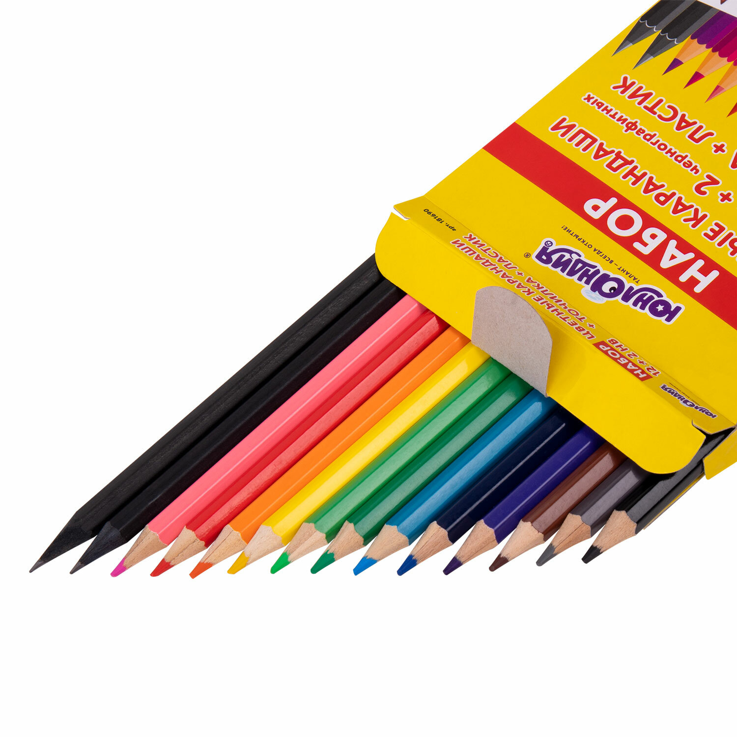 Набор состоит из 12 цветов: розовый, красный, желтый, оранжевый, салатовый, зеленый, голубой, синий, фиолетовый, коричневый, серый, черный и двух чернографитных карандашей. Ластик и точилка в комплекте. Шестигранная форма сечения корпуса позволяет карандашу не скатываться с поверхности стола во время занятий рисованием. Карандаши изготовлены из высококачественного дерева и имеют лакированный корпус. Яркий мягкий грифель диаметром 3 мм обладает повышенной прочностью и легко затачивается. Все карандаши заточены, поставляются в картонной упаковке с европодвесом.