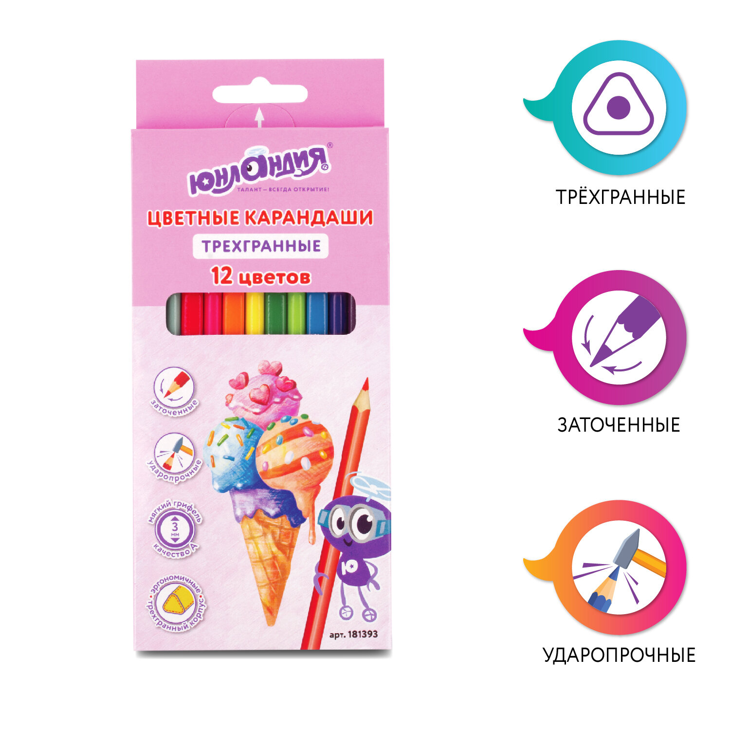 Набор состоит из 12 цветов: розовый, красный, желтый, оранжевый, салатовый, зеленый, голубой, синий, фиолетовый, коричневый, серый, черный. Яркие цвета развивают цветовосприятие ребенка. Трехгранная форма сечения корпуса позволяет не скатываться карандашу с поверхности стола во время занятий рисованием. Они изготовлены из древесины ценных пород и имеют лакированный корпус. Высокосортная древесина и качество исполнения гарантируют легкую заточку. Мягкий грифель качества "А" с диаметром 3 мм обладает повышенной прочностью, не ломается и не крошится при заточке. Все карандаши заточены и поставляются в картонной упаковке с европодвесом.
