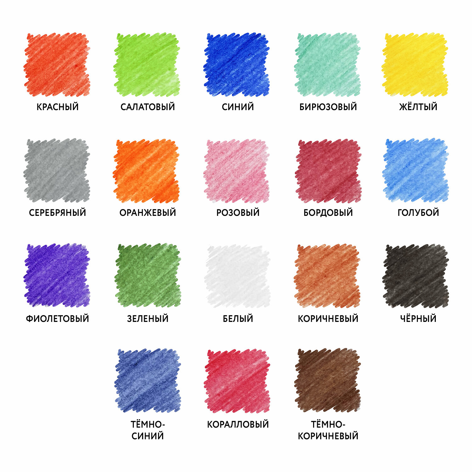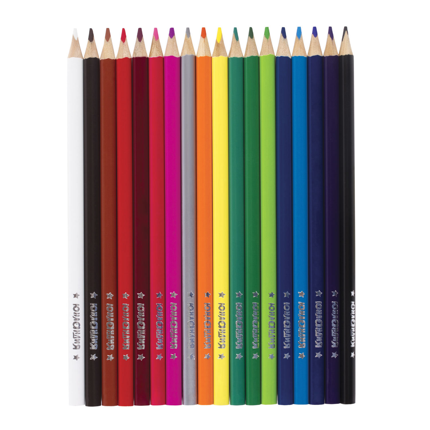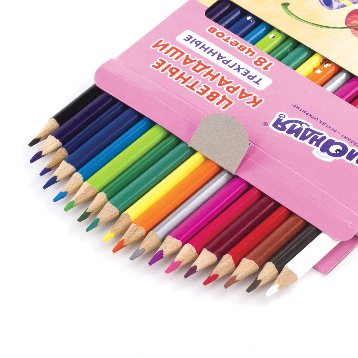Набор состоит из 18 цветов: черный, фиолетовый, синий, голубой, темно-синий, салатовый, зеленый, бирюзовый, желтый, оранжевый, серый, коралловый, розовый, коричневый, красный, бордовый, белый, темно-коричневый. Яркие цвета развивают цветовосприятие ребенка. Шестигранная форма сечения корпуса позволяет не скатываться карандашу с поверхности стола во время занятий рисованием. Они изготовлены из древесины ценных пород и имеют лакированный корпус. Высокосортная древесина и качество исполнения гарантируют легкую заточку. Мягкий грифель качества "А" с диаметром 3 мм обладает повышенной прочностью, не ломается и не крошится при заточке. Все карандаши заточены и поставляются в картонной упаковке с европодвесом.