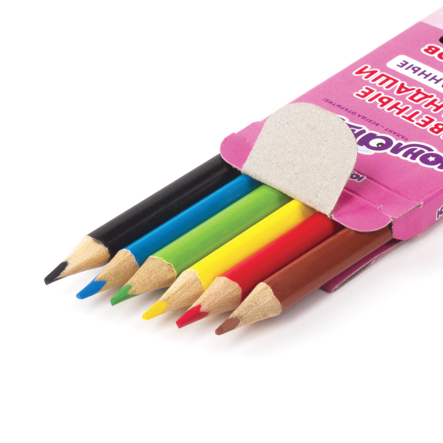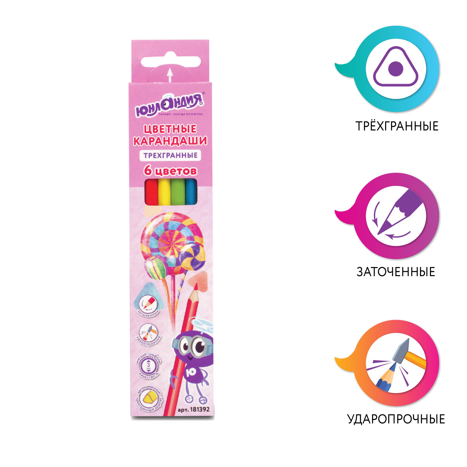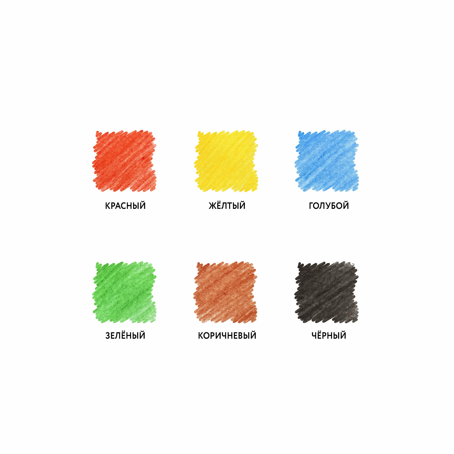 Набор состоит из 6 цветов: красный, желтый, зеленый, голубой, коричневый, черный. Яркие цвета развивают цветовосприятие ребенка. Шестигранная форма сечения корпуса позволяет не скатываться карандашу с поверхности стола во время занятий рисованием. Они изготовлены из древесины ценных пород и имеют лакированный корпус. Высокосортная древесина и качество исполнения гарантируют легкую заточку. Мягкий грифель качества "А" с диаметром 3 мм обладает повышенной прочностью, не ломается и не крошится при заточке. Все карандаши заточены и поставляются в картонной упаковке с европодвесом.
