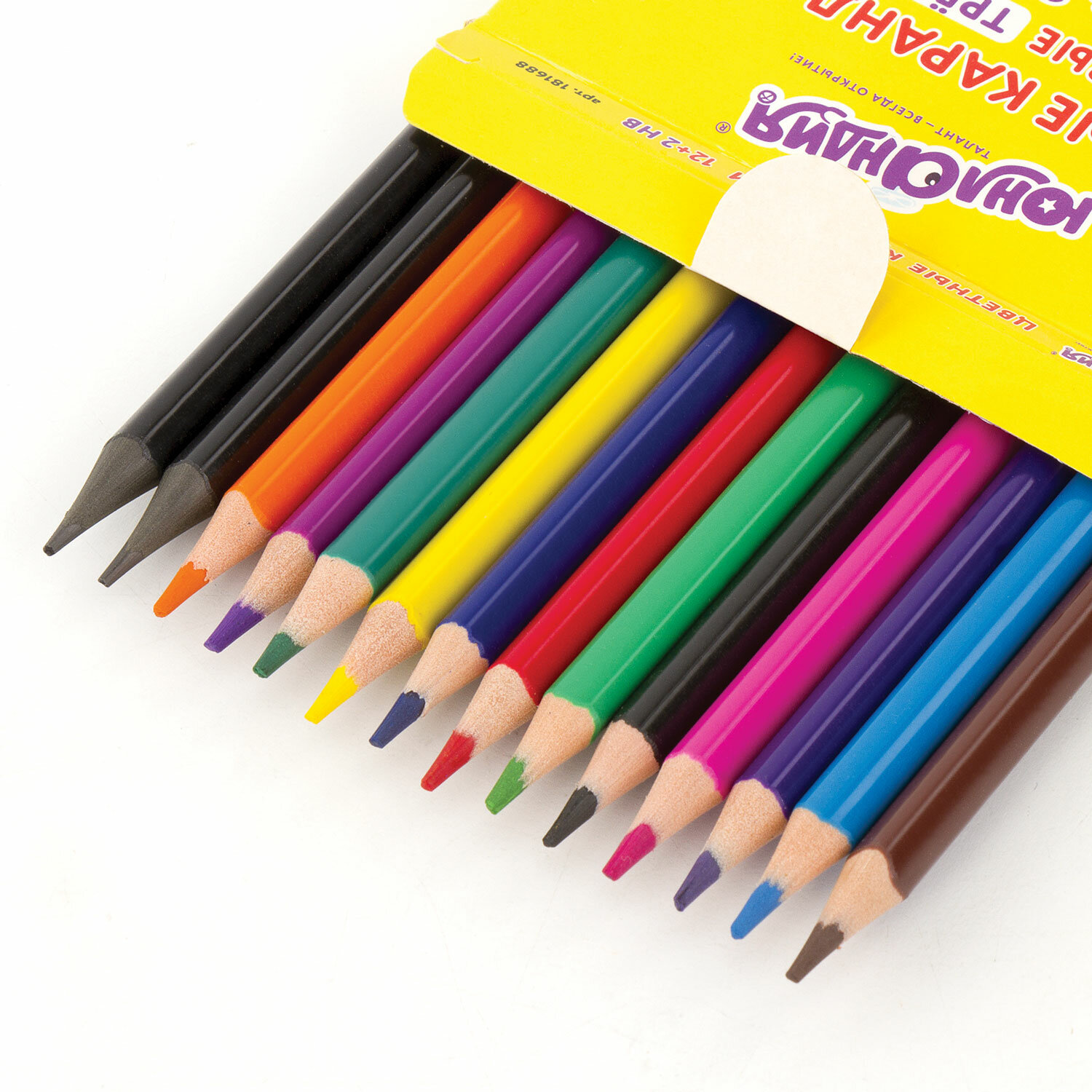Набор состоит из 12 цветов: розовый, красный, желтый, оранжевый, салатовый, зеленый, голубой, синий, фиолетовый, коричневый, серый, черный и двух чернографитных карандаша. Трехгранная форма сечения корпуса позволяет карандашу не скатываться с поверхности стола во время занятий рисованием. Карандаши изготовлены из пластика и имеют лакированный корпус, который при разломе не образует острые края и безопасен для детей. Яркий мягкий грифель диаметром 3 мм обладает повышенной прочностью и легко затачивается. Все карандаши заточены, и поставляются в картонной упаковке с европодвесом.