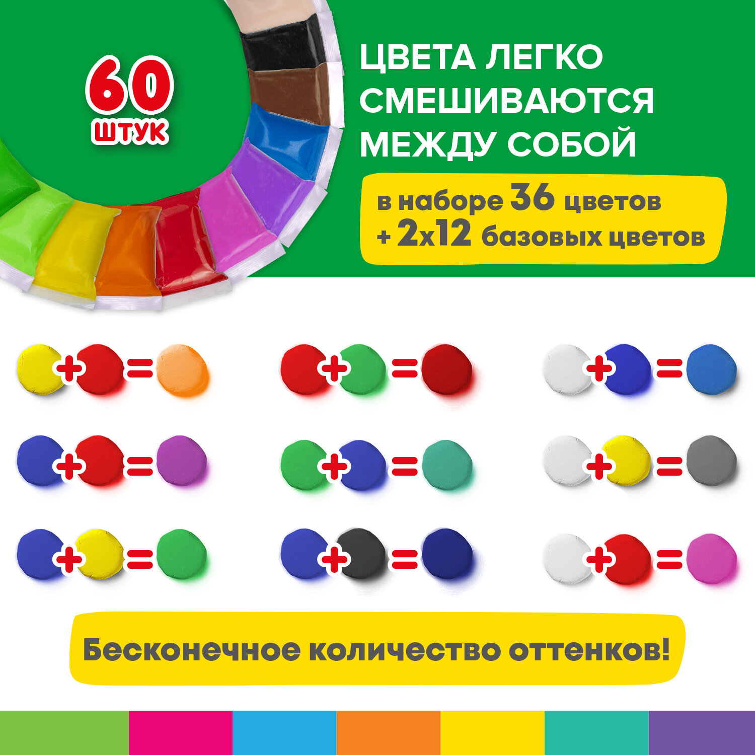 Масса набора - 600 г. Набор комплектуется 3 стеками. В наборе 60 брусков по 10 г различных цветов: 3 белых, 3 светло-розовых, 3 оранжевых, 3 фуксии, 3 красных, 3 желтых, 3 светло-зеленых, 3 зеленых, 3 синих, 3 фиолетовых, 3 коричневых, 3 черных, песочный, темно-оранжевый, коралловый, мягкий розовый, теплый розовый, сиреневый, темно-розовый, лайм, светло-синий, темно-синий, светло-коричневый, серый, лимонный, светло-оранжевый, морковный, роза, светлый мятный, мятный, изумрудный, папоротник, лаванда, лазурный, бежевый, светло-серый. В наборе среди 60 брусков - дополнительные 2 х 12 базовых цветов, которые наиболее часто используются в поделках. Супер экономично!